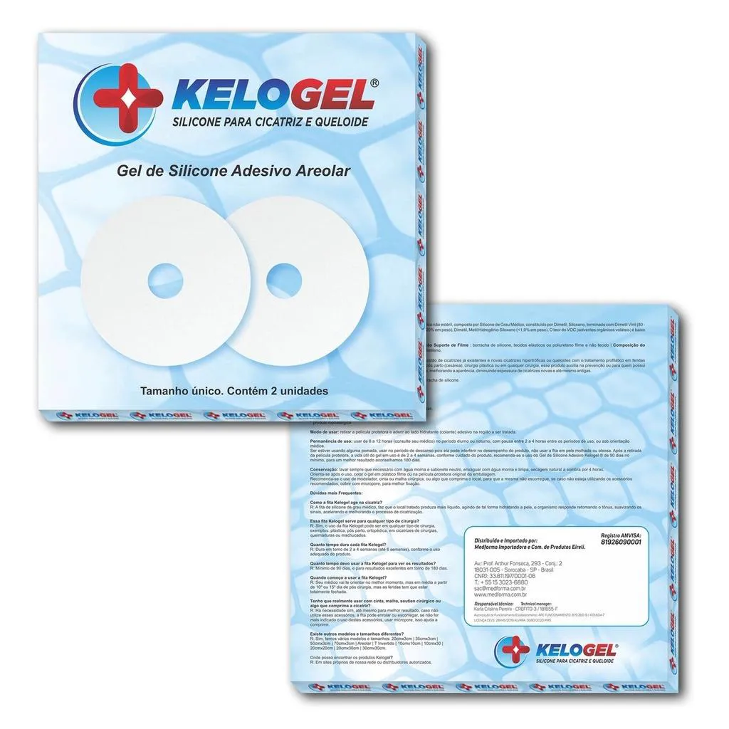 Indicação: O Gel de Silicone Adesivo Kelogel® é eficaz no tratamento de cicatrizes, cicatrizes hipertróficas e queloides em feridas fechadas. É indicado para uso em feridas, traumas, queimaduras, pós-parto (cesárea), cirurgias plásticas ou outras, auxiliando na prevenção de hipertrofia de cicatriz ou formação de queloides, melhorando a aparência e diminuindo a espessura de cicatrizes novas e antigas. Benefícios: Cicatrizes mais claras, menos avermelhadas e menos espessas. Contraindicação: Evite o uso do produto se for alérgico a borracha de silicone. Não use em feridas não cicatrizadas. Modo de usar: Higienize as mãos, certificando-se de que estejam livres de produtos oleosos. Limpe e sanitize a pele onde será aplicado, não use pomada, creme ou algo oleoso. Seque, retire a película protetora e aplique o lado colante na região. Use de 8 a 12 horas diurnas ou noturnas, com pausas de 2 a 4 horas entre os períodos de uso ou conforme orientação médica. Se estiver usando pomada, aplique durante o período de descanso, pois pode interferir no desempenho do produto. Após a retirada da película protetora, a vida útil do gel é de 2 a 4 semanas, dependendo dos cuidados. Recomenda-se o uso do Gel por no mínimo 90 dias, aconselhando-se 180 dias para melhores resultados. Conservação: Lave sempre que necessário com água morna e sabonete neutro, enxague com água morna, deixe secar naturalmente à sombra por 4 horas. Use modelador, cinta ou malha cirúrgica para comprimir o local e evitar que escorregue, cobrindo com micropore para melhor fixação. REGISTRO ANVISA/ MS nº 81926090001