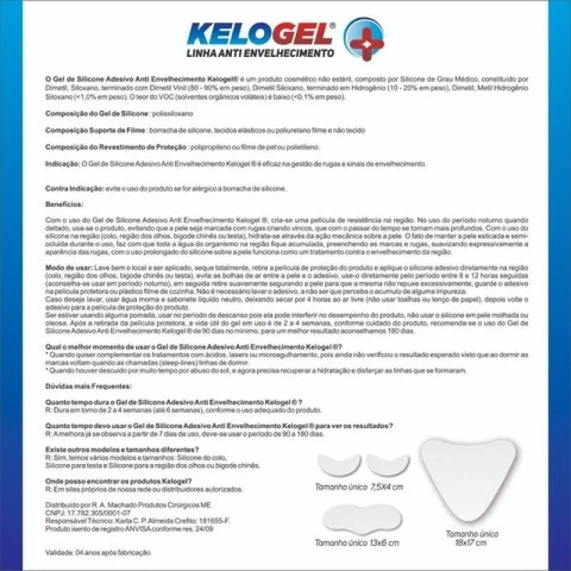 Indicação: O Gel de Silicone Adesivo antienvelhecimento Kelogel® evita que a pele seja marcada com rugas, que se tornam mais profundas com o tempo. Usado no colo, olhos, bigode chinês ou testa, hidrata a pele através da ação mecânica do silicone. Mantendo a pele esticada, a água do organismo acumula na região, preenchendo e suavizando marcas e rugas, funcionando como tratamento antienvelhecimento. Modo de uso: Limpe e sanitize a pele onde será aplicado, sem usar pomada, creme e afins. Seque a área, retire a película protetora e aplique o lado colante na região, evitando bolhas de ar. Use por 8 a 12 horas seguidas (preferencialmente à noite). Retire suavemente segurando a pele para evitar repuxar. Guarde o adesivo na película protetora ou plástico filme. Não é necessário lavar o adesivo, exceto se houver acúmulo de impurezas. Se necessário, lave com água morna e sabonete neutro, secar ao ar livre por 4 horas antes de voltar o adesivo para a película de proteção. Contraindicação: Não use se for alérgico a silicone. Não utilize em pele lesionada ou irritada. Conservação: A vida útil do gel em uso é de 10 a 25 dias. O gel permanece eficiente mesmo após perder a adesividade. Recomenda-se o uso com micropore para comprimir a área tratada. Para melhores resultados, use por no mínimo 90 dias, aconselhando-se 180 dias. REGISTRO ANVISA: 81926090001