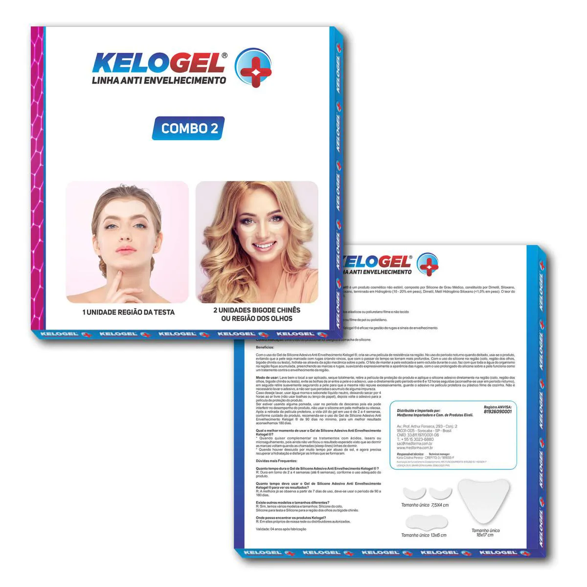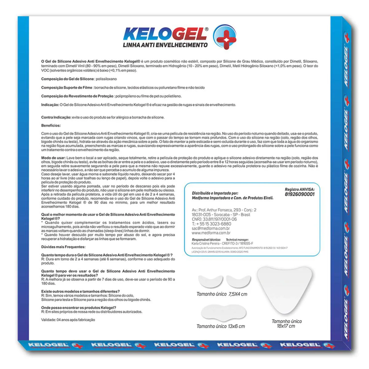 Indicação: O Gel de Silicone Adesivo antienvelhecimento Kelogel® evita que a pele seja marcada com rugas, que se tornam mais profundas com o tempo. Usado no colo, olhos, bigode chinês ou testa, hidrata a pele através da ação mecânica do silicone. Mantendo a pele esticada, a água do organismo acumula na região, preenchendo e suavizando marcas e rugas, funcionando como tratamento antienvelhecimento. Modo de uso: Limpe e sanitize a pele onde será aplicado, sem usar pomada, creme e afins. Seque a área, retire a película protetora e aplique o lado colante na região, evitando bolhas de ar. Use por 8 a 12 horas seguidas (preferencialmente à noite). Retire suavemente segurando a pele para evitar repuxar. Guarde o adesivo na película protetora ou plástico filme. Não é necessário lavar o adesivo, exceto se houver acúmulo de impurezas. Se necessário, lave com água morna e sabonete neutro, secar ao ar livre por 4 horas antes de voltar o adesivo para a película de proteção. Contraindicação: Não use se for alérgico a silicone. Não utilize em pele lesionada ou irritada. Conservação: A vida útil do gel em uso é de 10 a 25 dias. O gel permanece eficiente mesmo após perder a adesividade. Recomenda-se o uso com micropore para comprimir a área tratada. Para melhores resultados, use por no mínimo 90 dias, aconselhando-se 180 dias. REGISTRO ANVISA: 81926090001