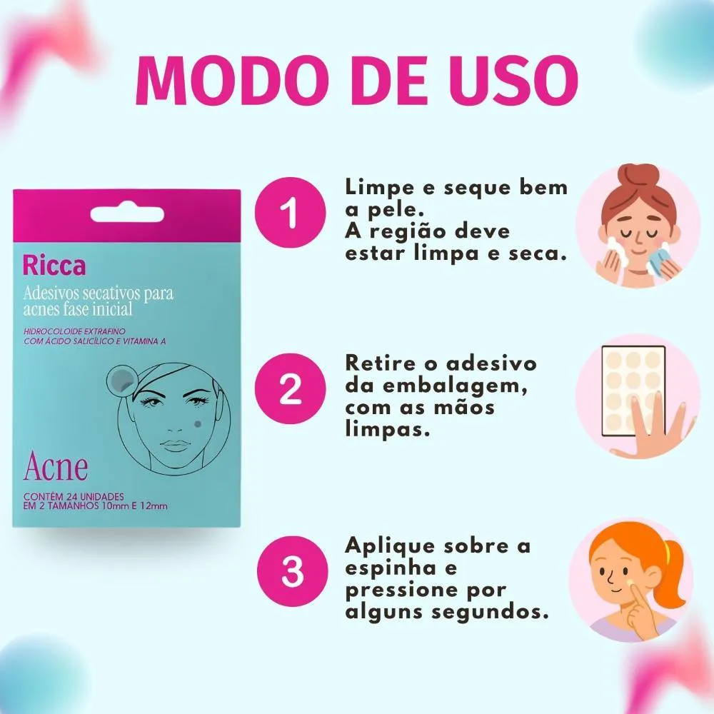 Os Adesivos Secativos Ricca são perfeitos para uso diário, seja em casa ou em movimento. Aplique-os antes da maquiagem para uma proteção invisível ou durante a noite para um tratamento intensivo enquanto você dorme. São ideais para emergências, eventos importantes, viagens ou simplesmente para manter a pele impecável no dia a dia. Leve-os sempre com você, na bolsa ou nécessaire, para estar sempre preparada.Modo de Uso/Aplicação