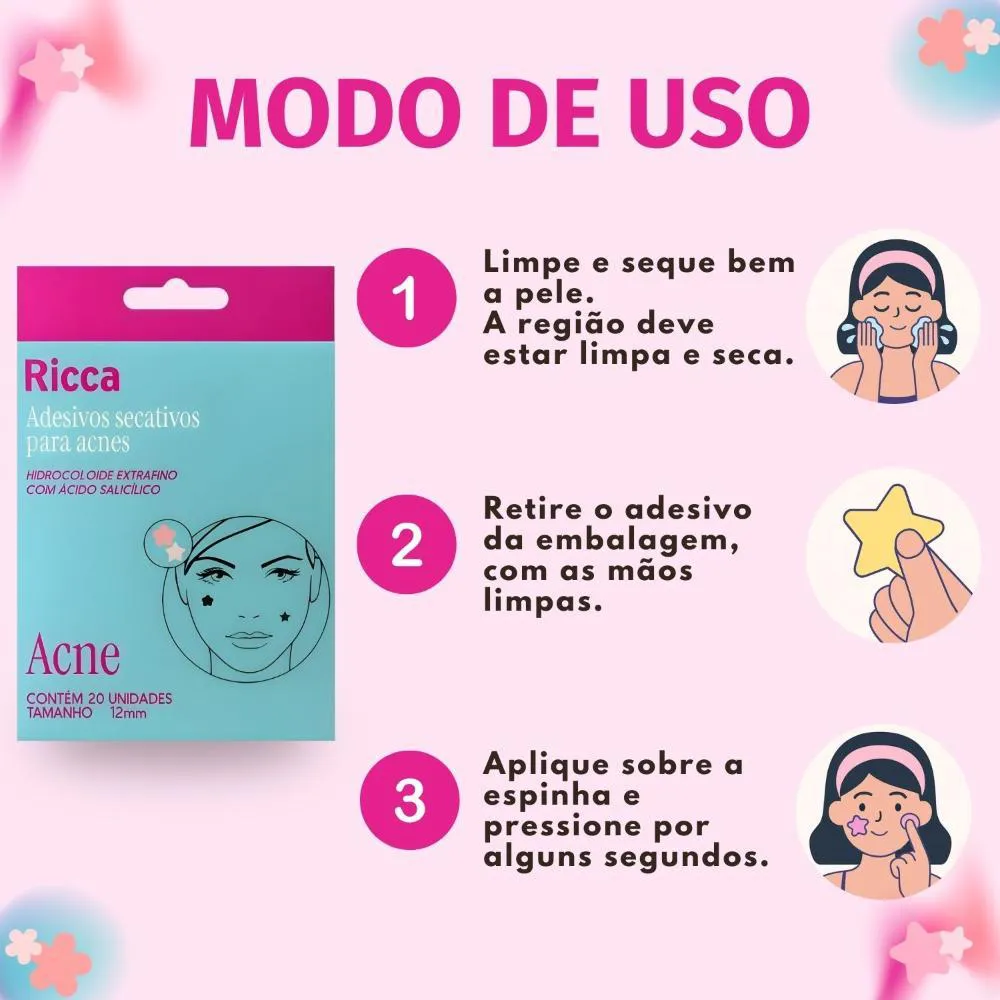Ideal para o tratamento da acne em qualquer momento, os Adesivos Secativos Ricca são perfeitos para combater espinhas inoportunas, seja no dia a dia ou antes de eventos importantes. Use-os para manter sua pele saudável, uniforme e livre de imperfeições. Perfeitos para usar antes de uma festa, reunião importante ou em qualquer situação que você queira se sentir mais confiante com a sua pele.Modo de Uso/Aplicação