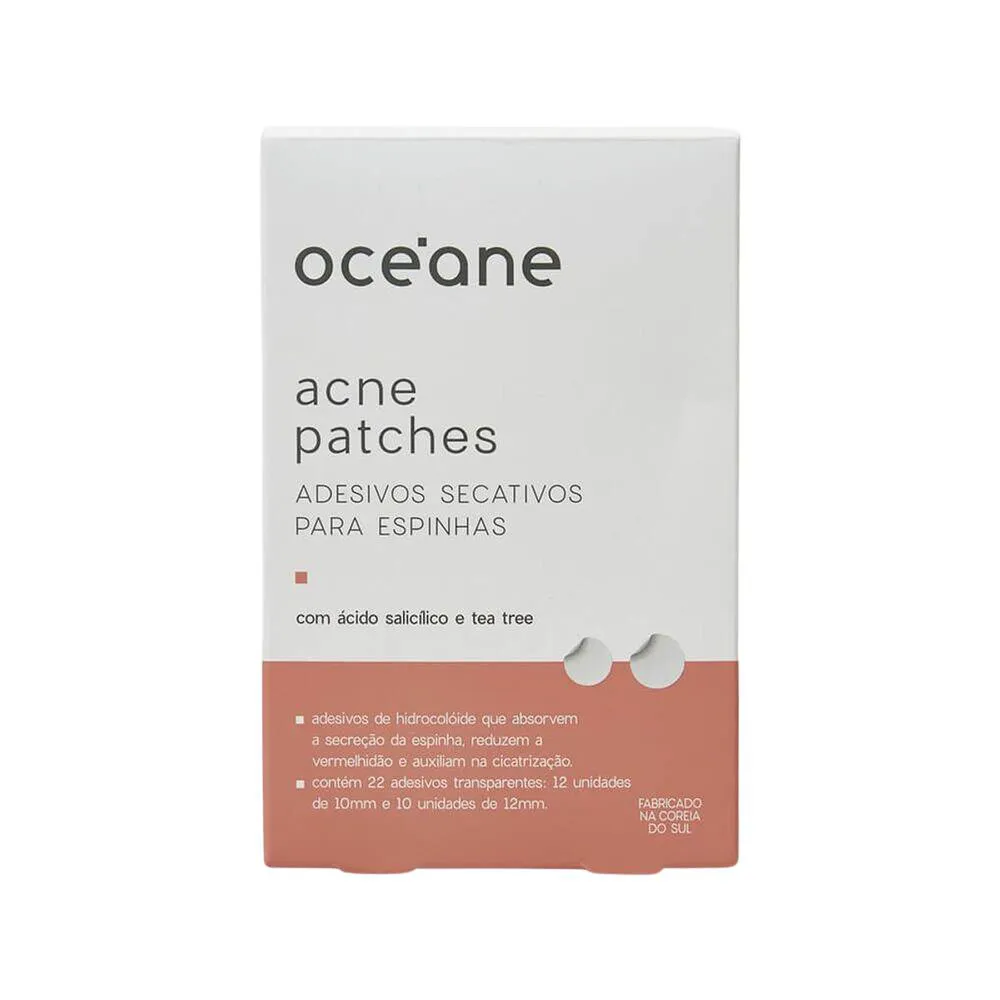 Os Acne Patches da Océane são adesivos secativos desenvolvidos para tratar espinhas inflamadas de forma prática, discreta e eficaz. Indicados para uso pontual, eles absorvem a secreção, ajudam na cicatrização e protegem a área afetada contra infecções e contaminações externas. A fórmula combina hidrocolóide, ácido salicílico e óleo de tea tree, ativos que controlam a oleosidade, reduzem a inflamação e aceleram o processo de recuperação da pele. Os adesivos são ultrafinos, transparentes e estão disponíveis em dois tamanhos, facilitando o uso em diferentes áreas do rosto.