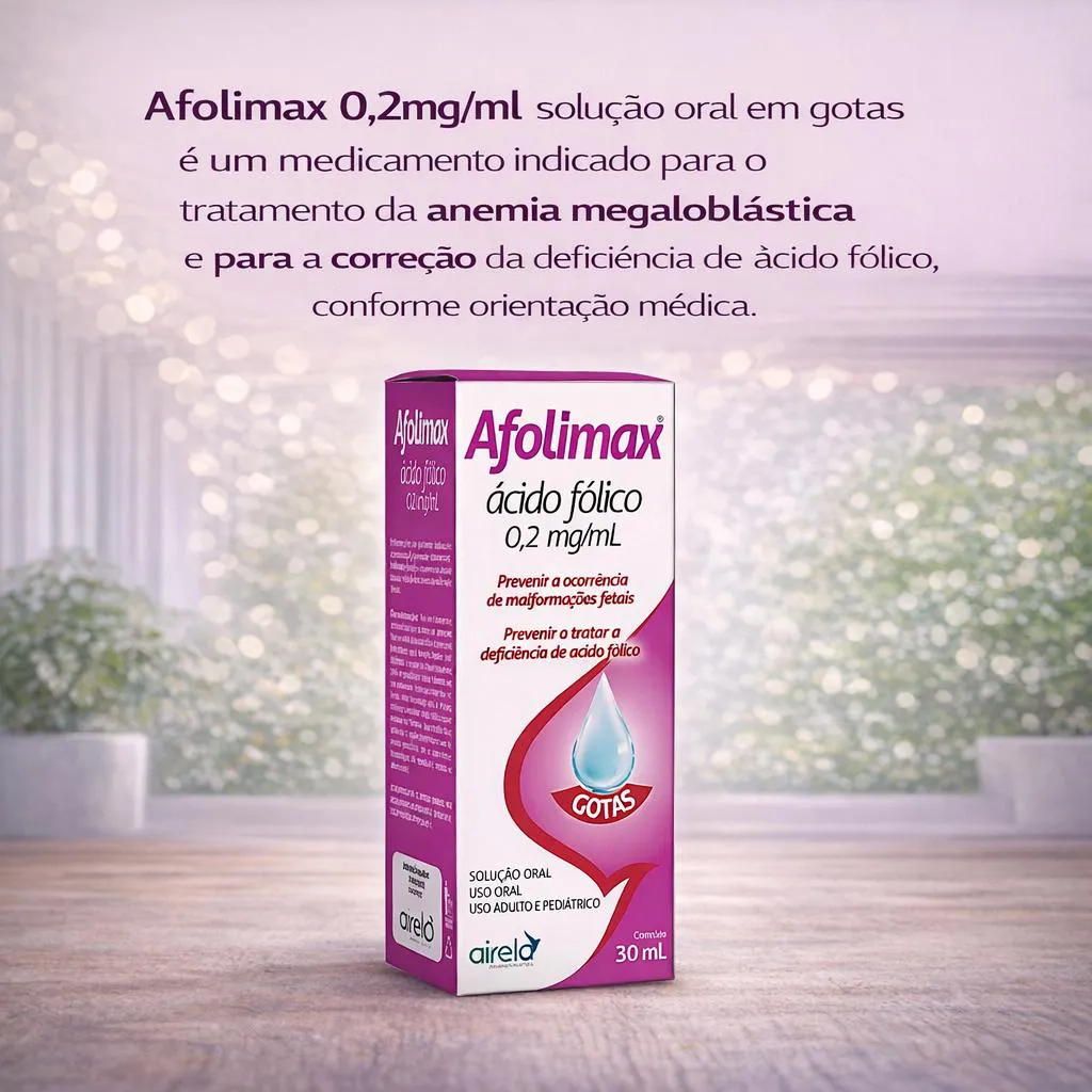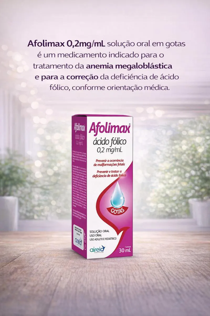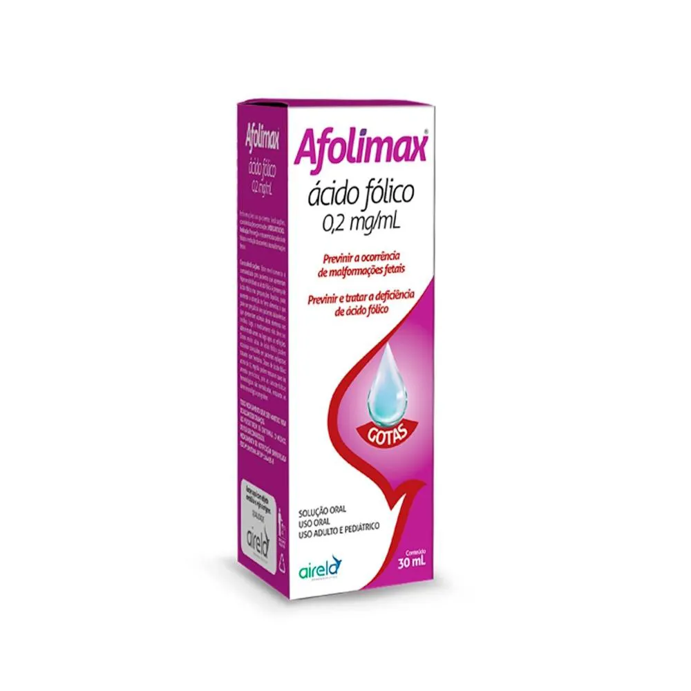 Afolimax 0,2mg/mL solução oral em gotas é um medicamento indicado para o tratamento da anemia megaloblástica e para a correção da deficiência de ácido fólico, conforme orientação médica.Sua fórmula contém ácido fólico 0,2mg por mL, nutriente essencial para a formação adequada das células sanguíneas e para o metabolismo celular.A apresentação em solução oral em gotas permite ajuste individualizado da dose, facilitando a administração, especialmente em crianças e pacientes com dificuldade de deglutição.Produto fabricado pela Airela, disponível em embalagem com 30mL.Medicamento. Utilize conforme prescrição médica.