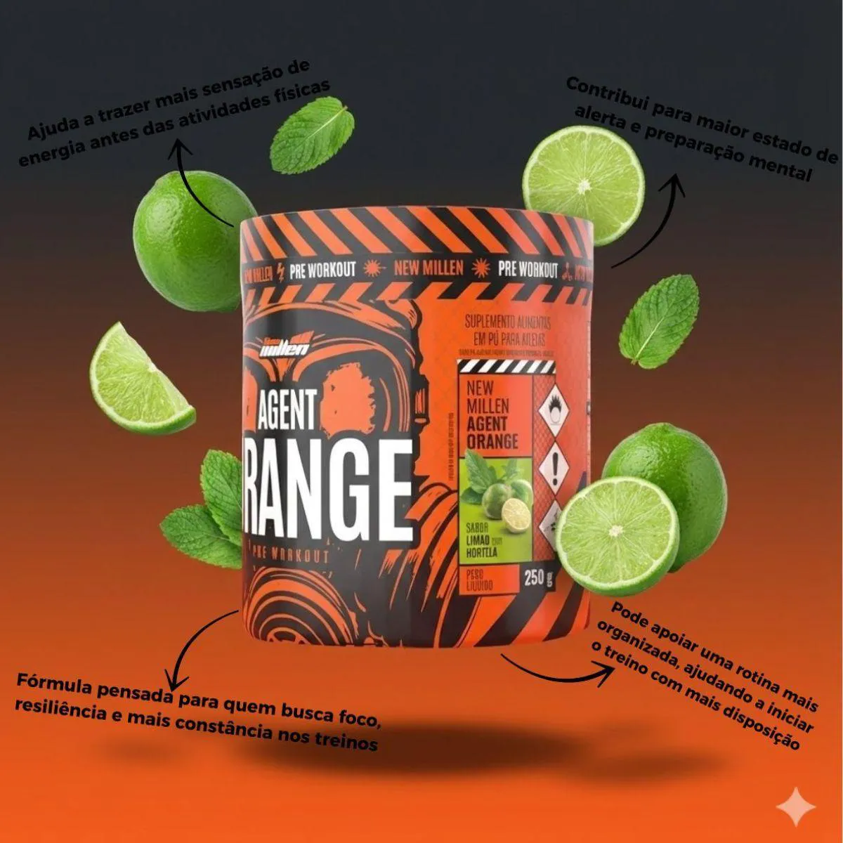 AGENT ORANGE LIMÃO COM HORTELÃ pré treino FOCO E RESILIÊNCIA 250G NEW MILLEN