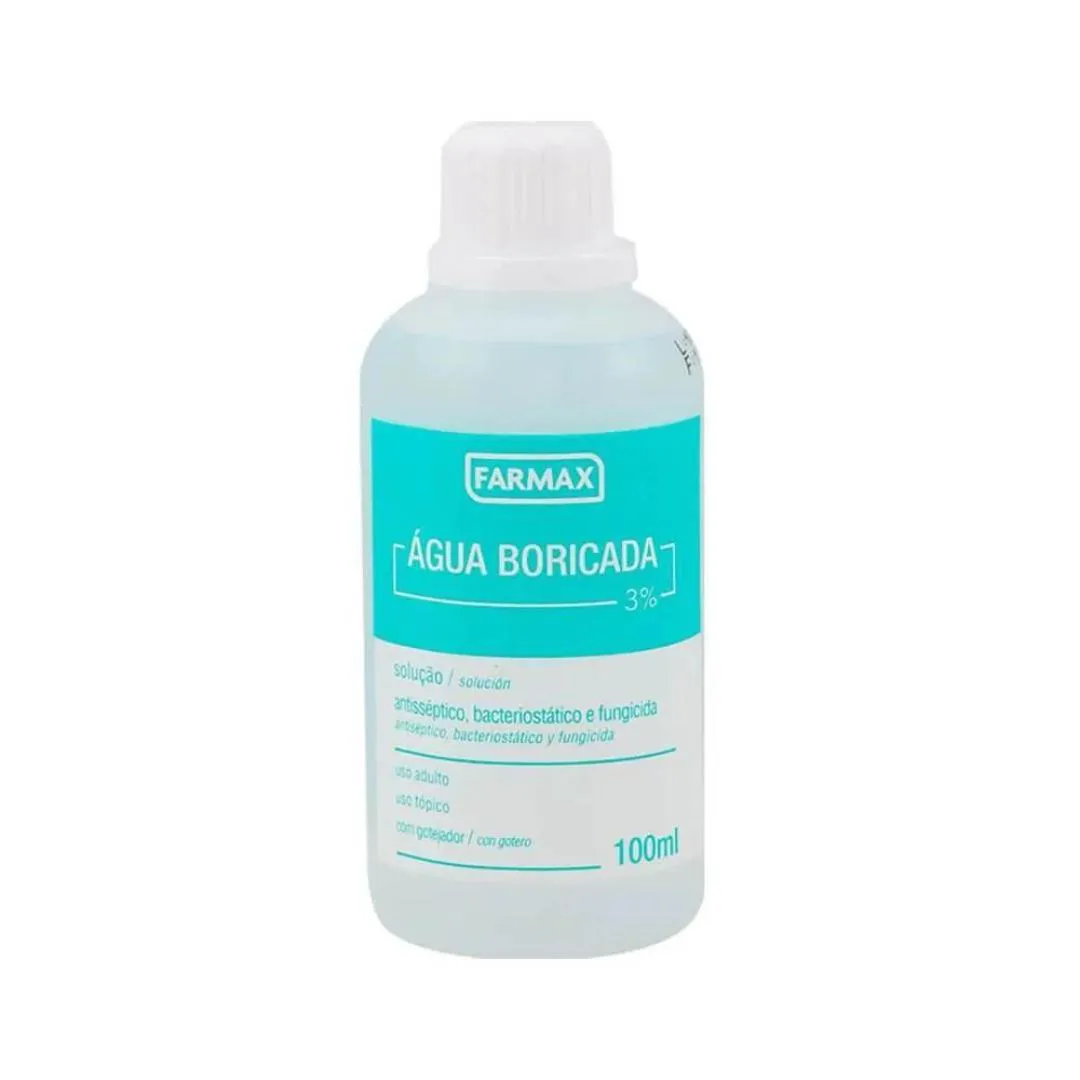Água Boricada 3% 100ml Farmax Produto: Água Boricada 3% Marca: Farmax Apresentação: A Água Boricada 3% da Farmax é apresentada em um frasco de 100ml, oferecendo uma solução prática e eficaz para diversos usos tópicos. Sua fórmula contém ácido bórico a 3%, conhecido por suas propriedades antissépticas e anti-inflamatórias. Descrição: A Água Boricada 3% da Farmax é uma solução aquosa destinada ao uso externo, amplamente utilizada para a limpeza e assepsia da pele e dos olhos. Este produto é eficaz na prevenção e no tratamento de infecções leves, proporcionando alívio rápido e seguro. Benefícios: