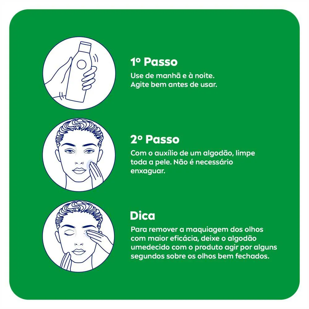 Pode ser usado diariamente para retirar a maquiagem e fazer a limpeza das impurezas. Dermatologicamente e oftalmologicamente testado, é indicado para a pele do rosto, lábios e região dos olhos, não sendo necessário enxaguar.