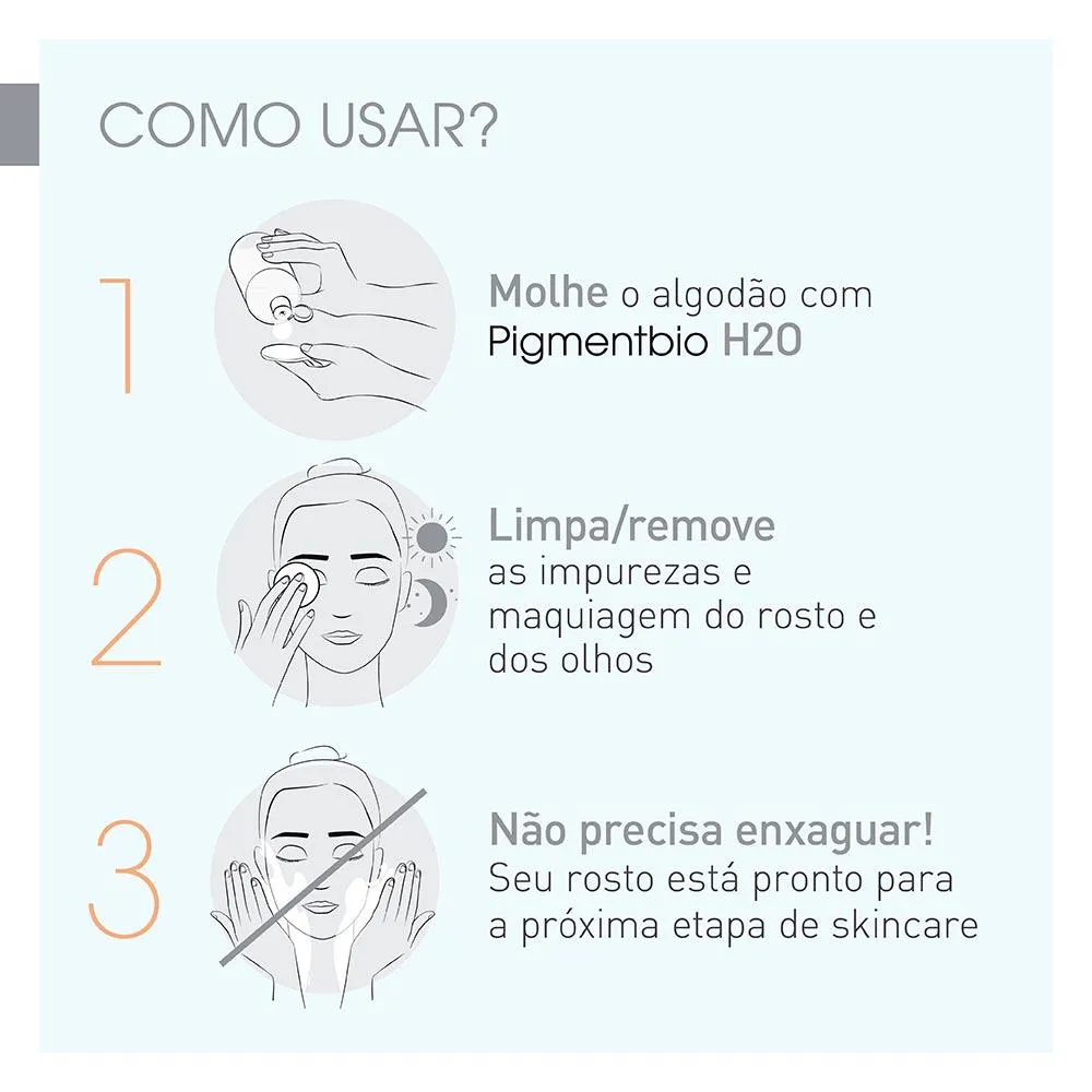 Higiene sem enxágue. Fórmula hipoalergênica, segura para rosto, olhos e pescoço, dermatologicamente testada. Pode ser utilizada todos os dias para higienizar e demaquilar a pele. Ideal para uso associado com outros cuidados clareadores, como Pigmentbio C Concentrate. Sem álcool, sem corantes, sem perfume, sem sabão, sem parabenos. pH fisiológico.