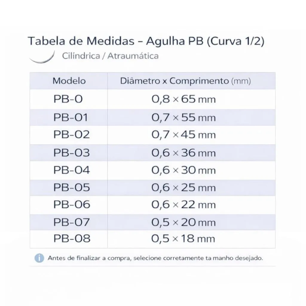 REGISTRO ANVISA | PONTA CILÍNDRICA | 100% AÇO INOX | ESTÉRIL Precisão cirúrgica com o mínimo de esforço. Se você busca uma sutura que desliza sem travar e garante o fechamento perfeito do tecido, a Agulha Tipo PB é sua melhor aliada. 100% Aço Inox com certificação ANVISA para total segurança profissional. Beneficios que fazem diferença:
