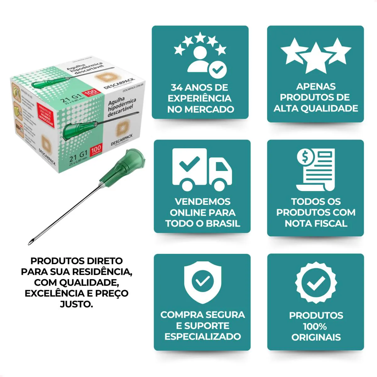 A Agulha Hipodérmica Descarpack é uma agulha descartável esterilizada para uso único.