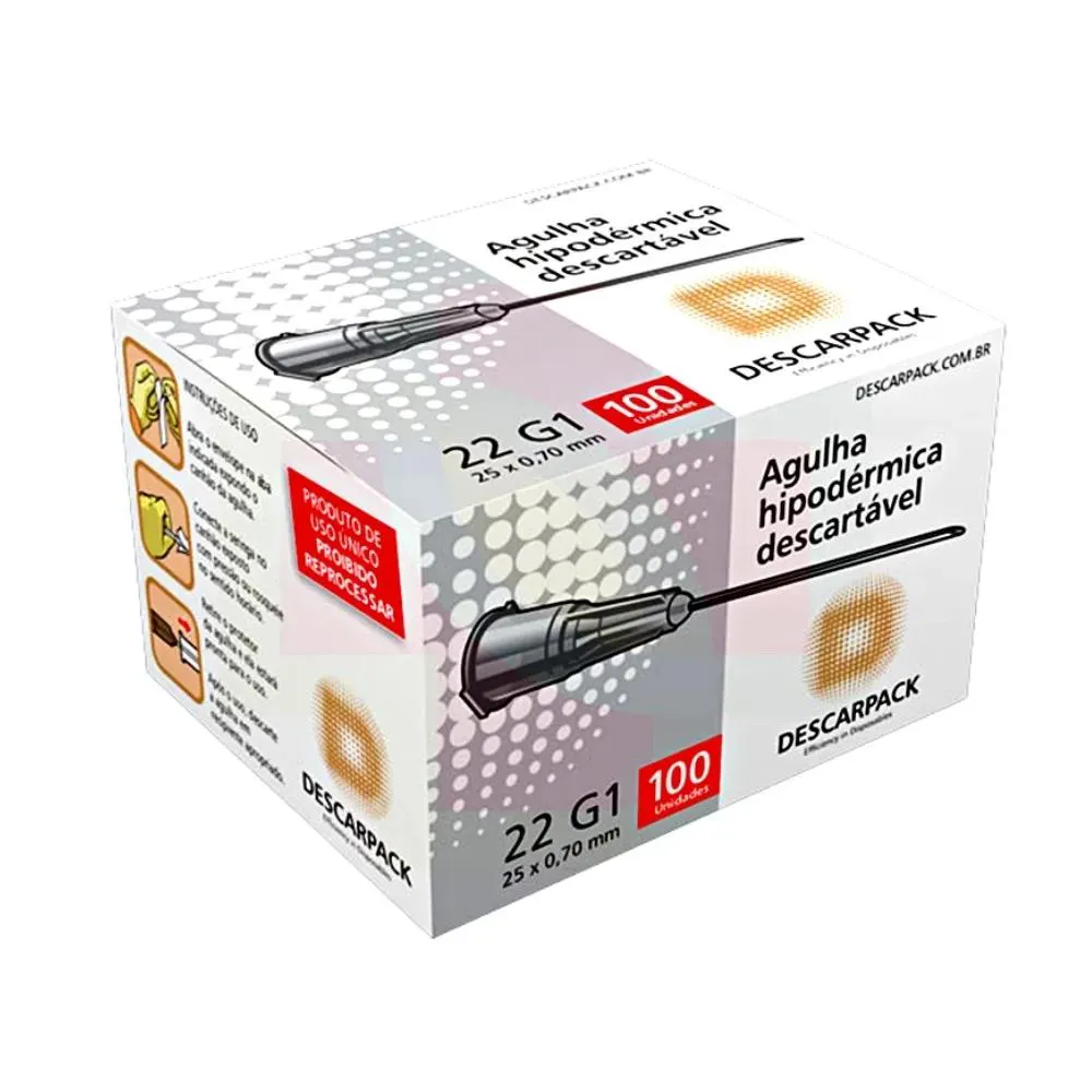 Agulha Hipodérmica Descartável 25x0,70mm c/100un Descarpack Utilizadas na aplicação de soluções e medicamentos em diferentes vias de administração: endovenosa, intramuscular, intradérmica e subcutânea. Podem ser utilizadas também na coleta de sangue e de outros fluidos corporais. Características: