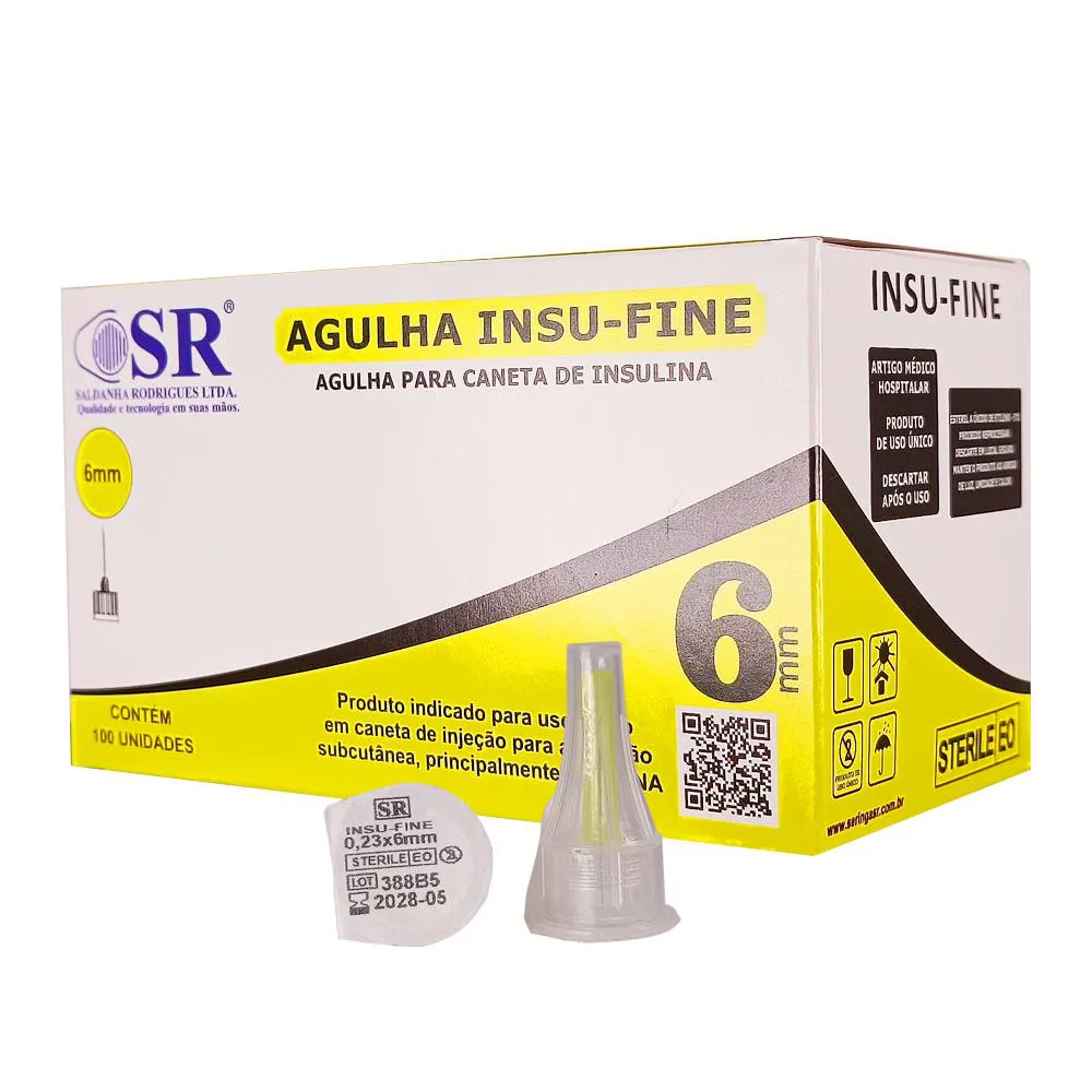 Agulha Insu Fine - Agulhas para Caneta de Insulina 6mm x 32G Caixa/Kit com 100 unidades Indicação: As agulhas para caneta de insulina são indicadas para administração multi-dose de insulina no corpo. Possuem bisel trifacetado siliconizado, permitindo injeções mais suaves e confortáveis. Descrição: