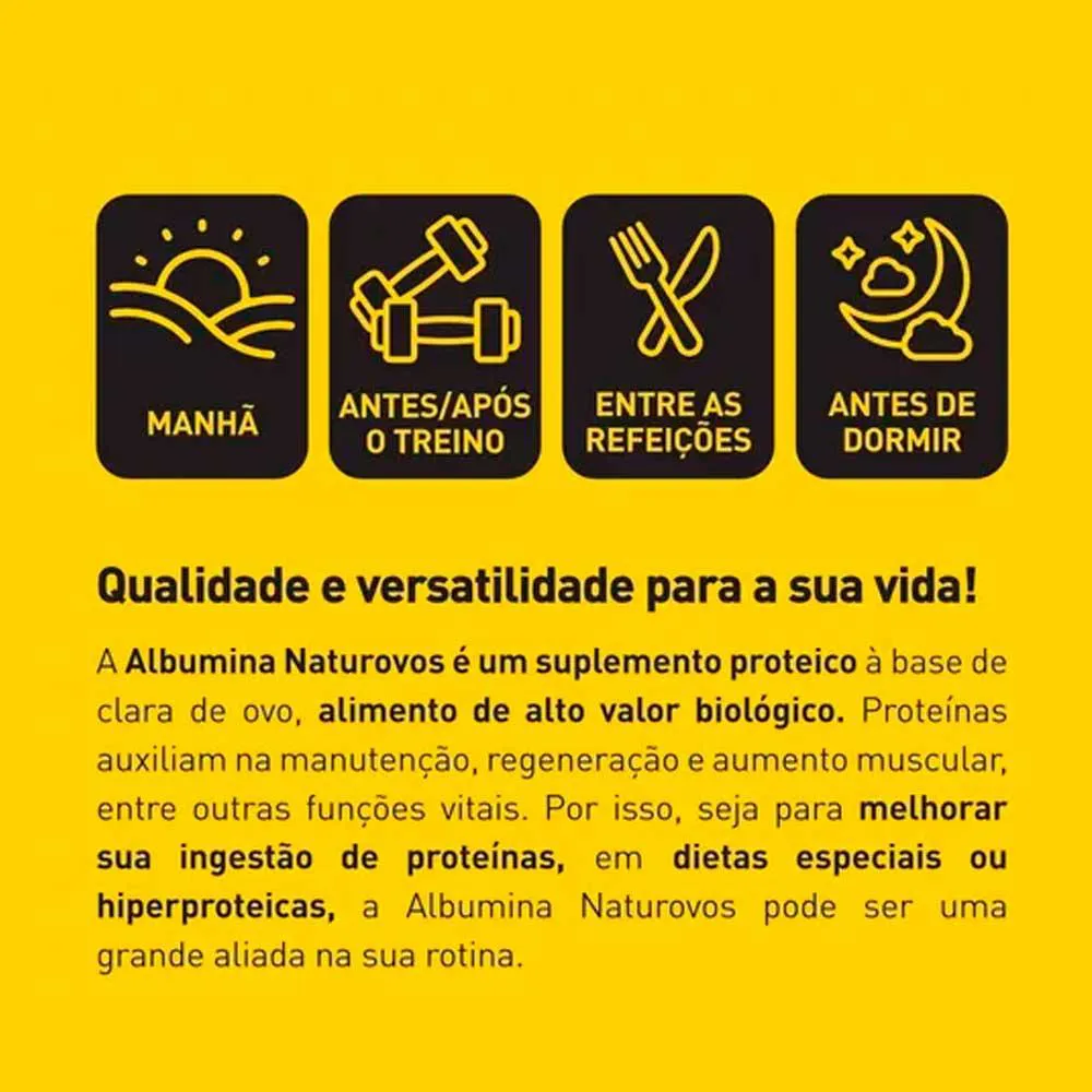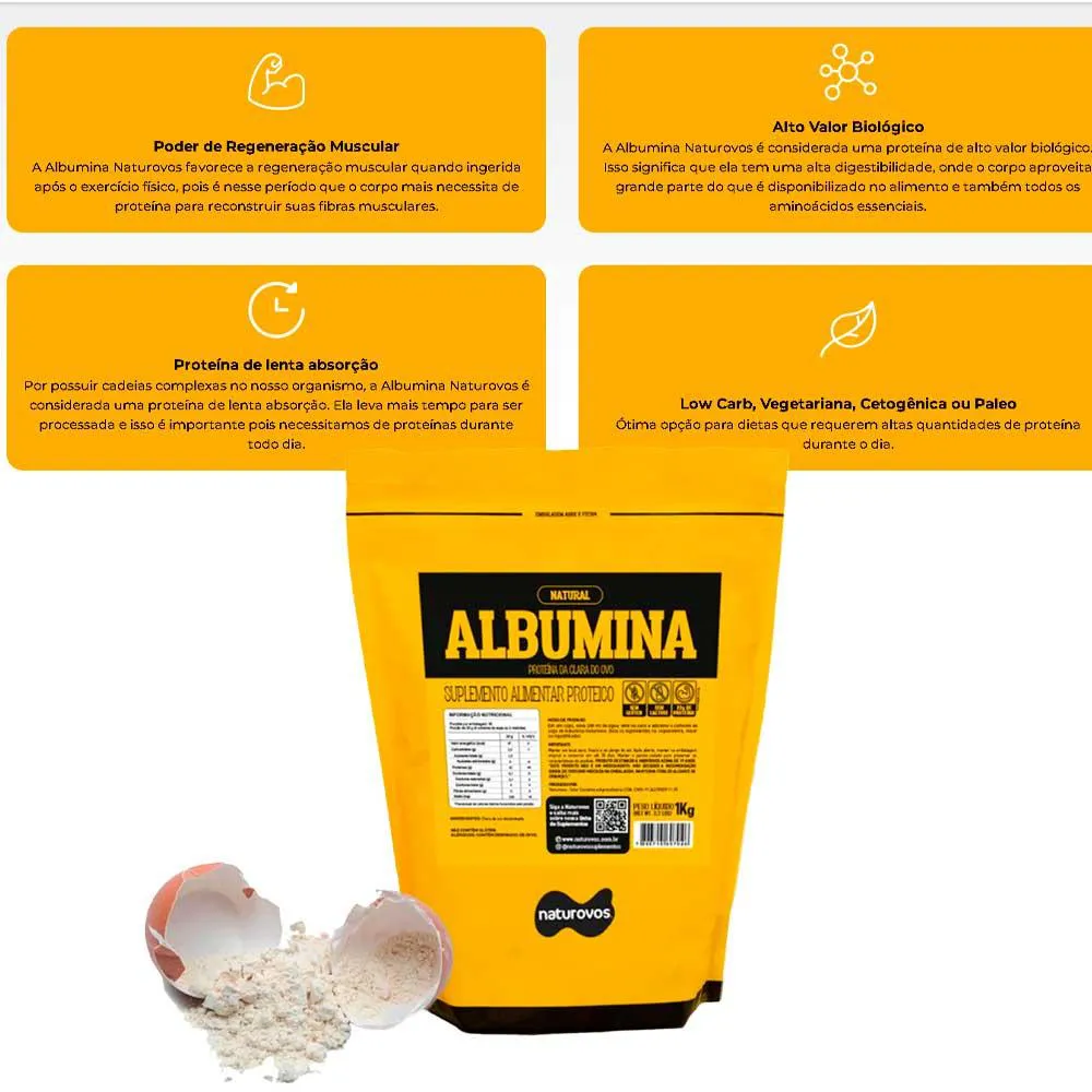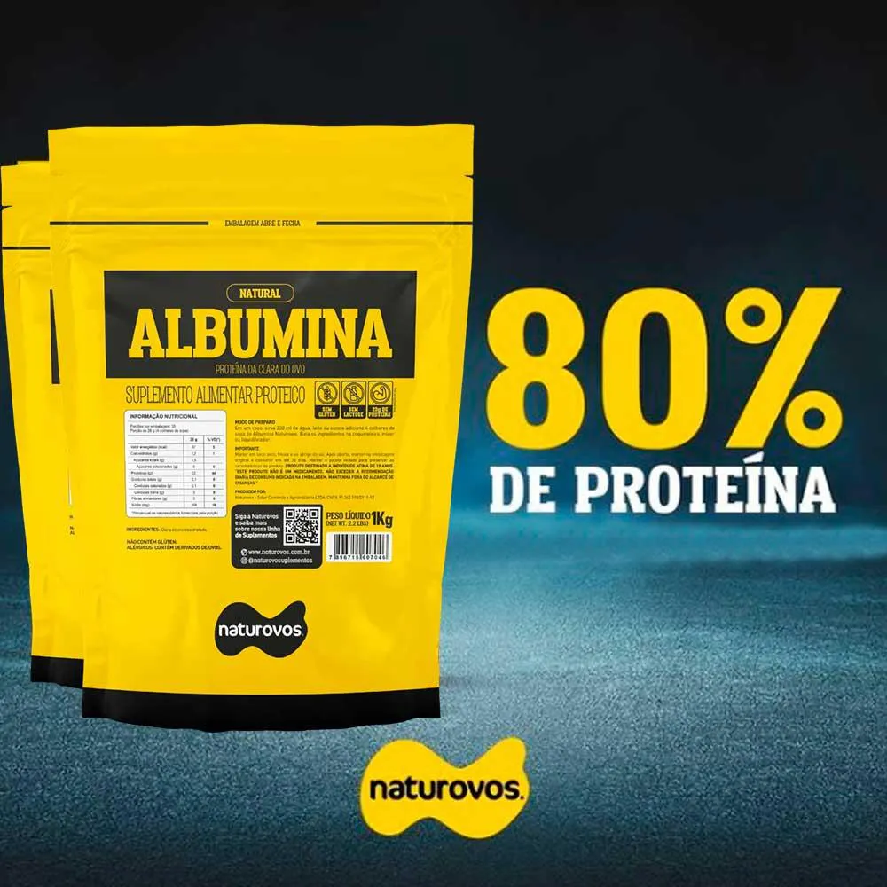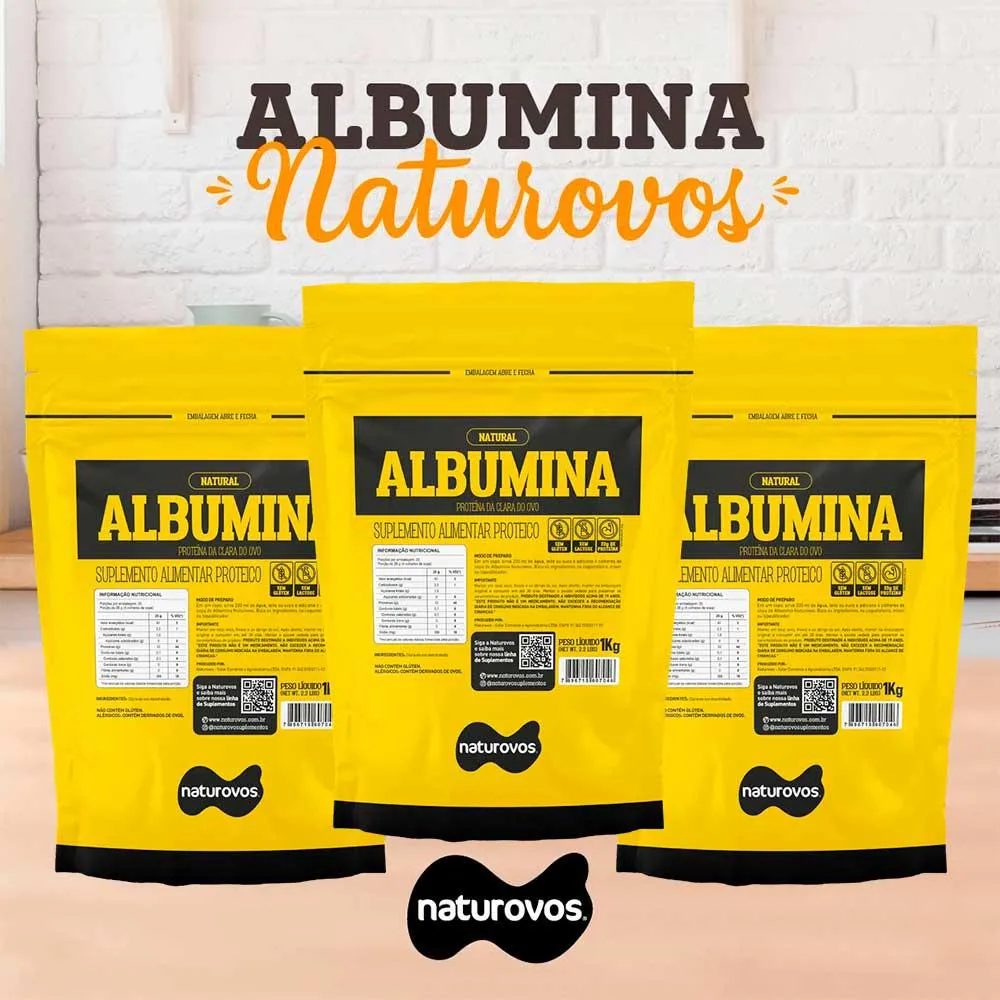 *********************** ALBUMINA NO SABOR NATURAL *********************** A Albumina Naturovos é preparada através da clara de ovo em pó, proveniente de ovos frescos, lavados e selecionados. Em equipamento especial, o ovo é quebrado para separação da clara e da gema. A clara do ovo é filtrada, pasteurizada e então desidratada, tornando-se um pó rico em proteínas, com vitaminas e sais minerais e baixíssimo em gorduras. Elaborada sem glúten ou lactose, a Albumina Naturovos é referência de qualidade no Brasil. Uma porção de 28g de Albumina Naturovos, equivale a aproximadamente 22g de proteína, cerca de 7 claras de ovo. BENEFÍCIOS: Alto Valor Biológico Proteína de lenta absorção Low Carb, Vegetariana, Cetogênica ou Paleo INGREDIENTES: Clara de ovo desidratada, aromatizante e edulcorante sucralose. NÃO CONTÉM GLÚTEN. ALÉRGICOS: CONTÉM DERIVADOS DE OVOS. Advertências: "ESTE PRODUTO NÃO É UM MEDICAMENTO" "ESTE PRODUTO É UM SUPLEMENTO ALIMENTAR" "MANTENHA FORA DO ALCANCE DE CRIANÇAS" "NÃO EXCEDER A RECOMENDAÇÃO DIÁRIA DE CONSUMO INDICADA NA EMBALAGEM" Registro no M.S. nº Produto dispensado de registro RDC 240 de 2018