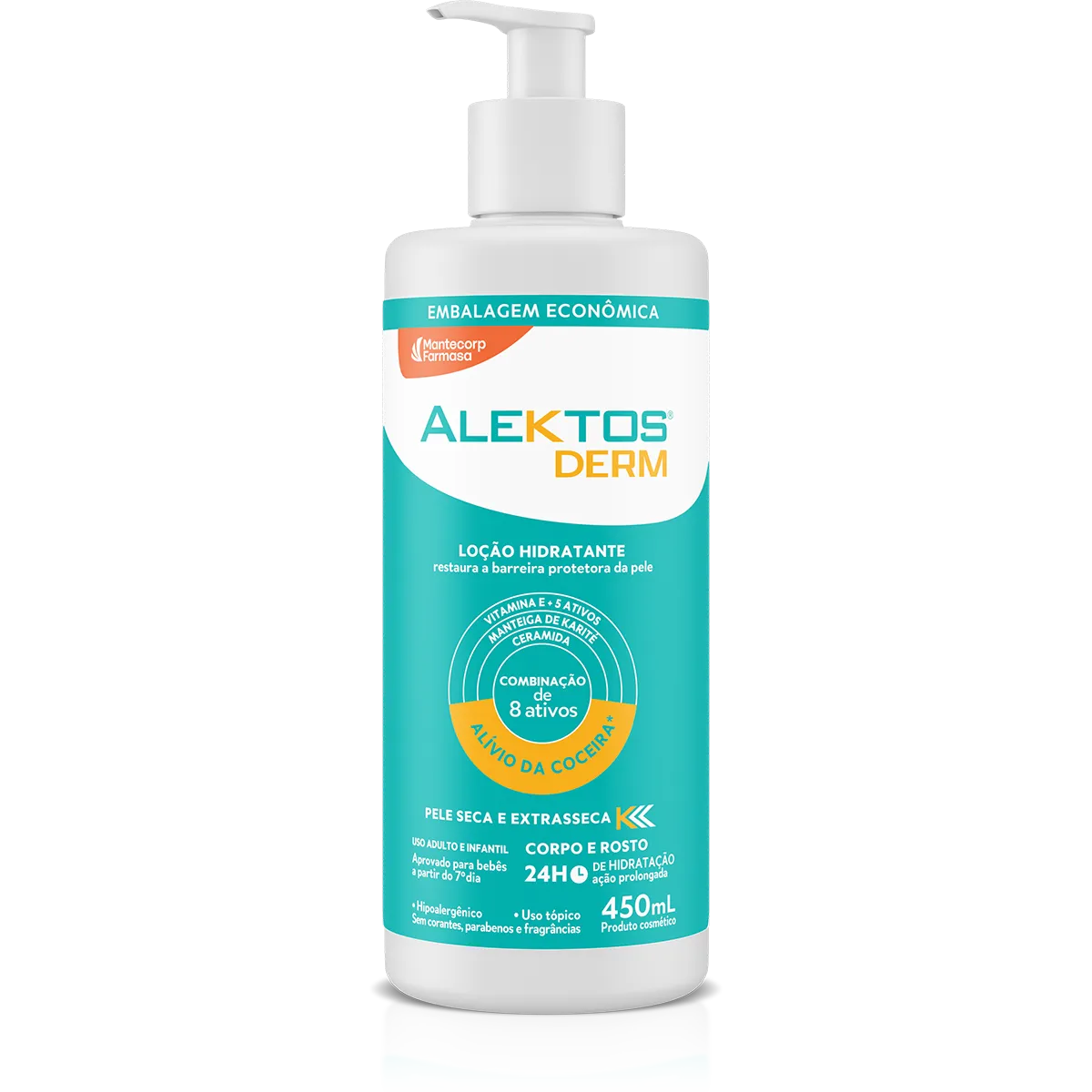 Alektos Derm é uma loção hidratante desenvolvida para restaurar a barreira protetora da pele. Indicada para peles secas, extrassecas e com tendência atópica, pode ser utilizada tanto no rosto quanto no corpo. Aprovada para uso em adultos e bebês a partir do 7º dia de vida, Alektos Derm proporciona hidratação intensa e duradoura, aliviando a coceira e o desconforto causados pelo ressecamento.