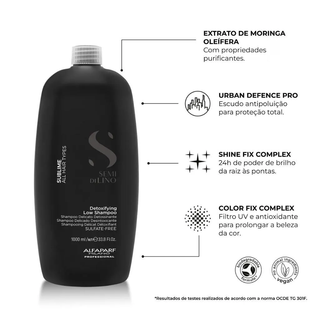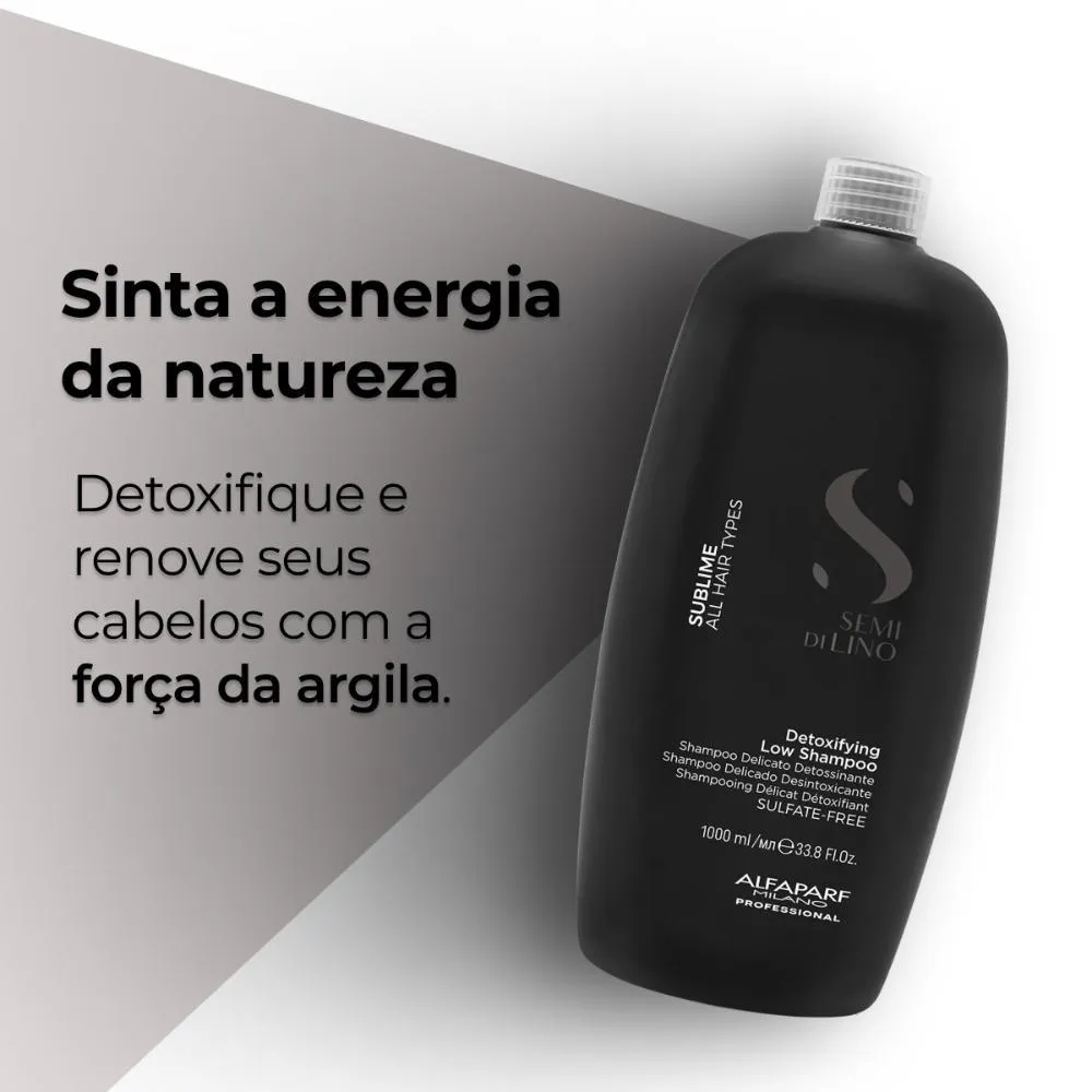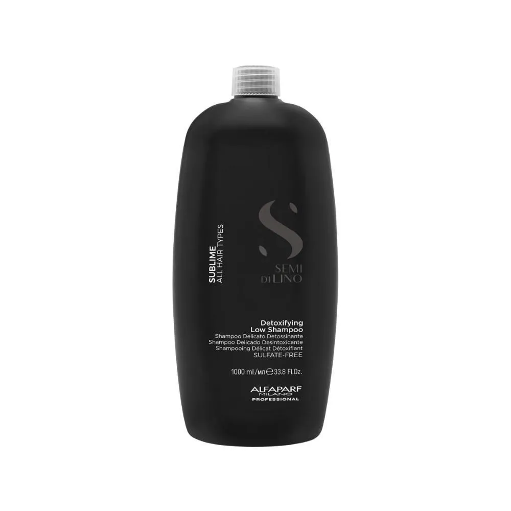 Alfaparf Semi di Lino Sublime Detoxifying Low shampoo 1000mlDetoxifying Low Shampoo limpa delicadamente e proporciona uma limpeza intensa, removendo resíduos de produtos cosméticos, saís de água dura, cloro, excesso de oleosidade, impurezas e partículas poluentes, deixando os cabelos limpos, leves e com aparência saudável.