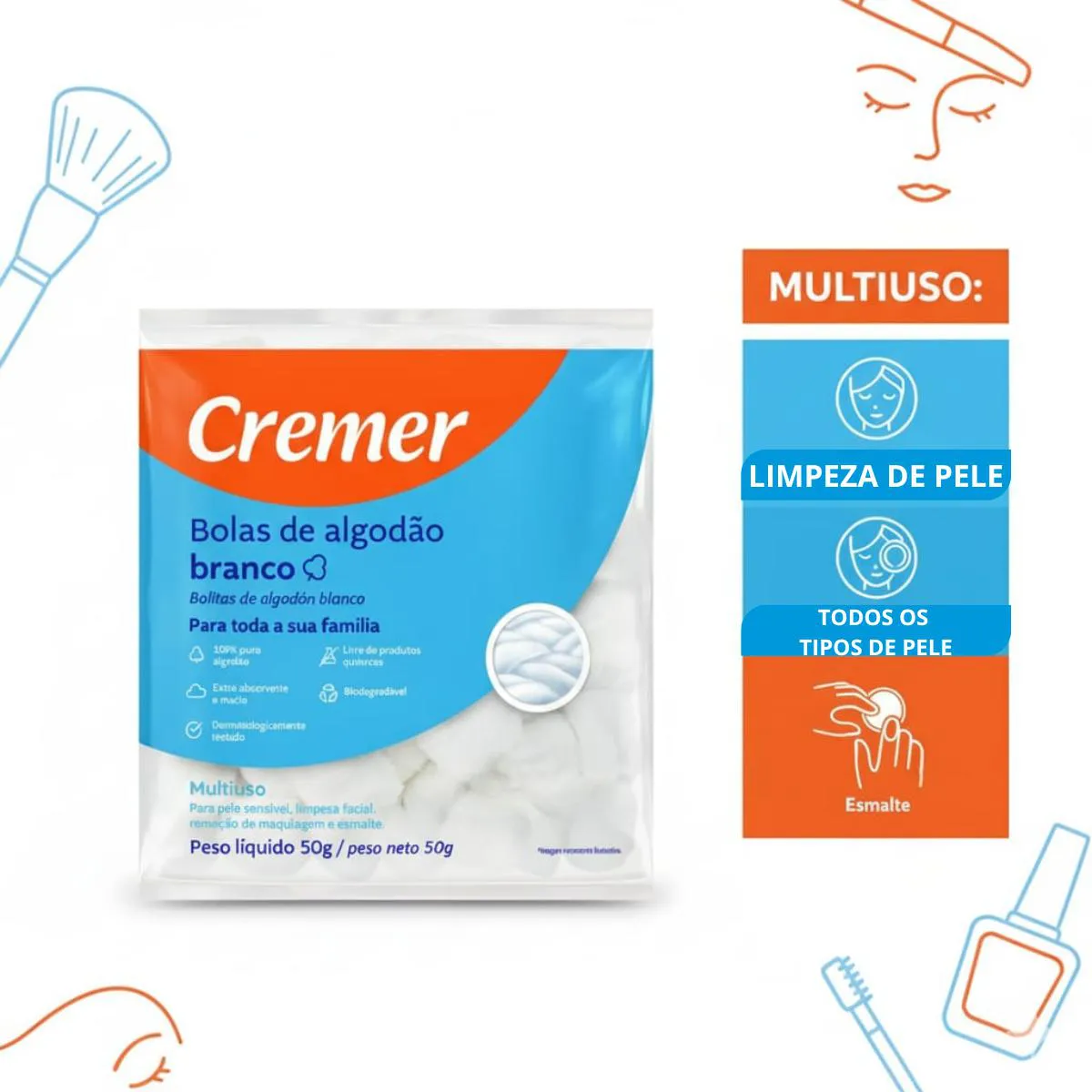 Algodão Bola Branco Cremer 50G Puro Pacote Unhas - Curativo
