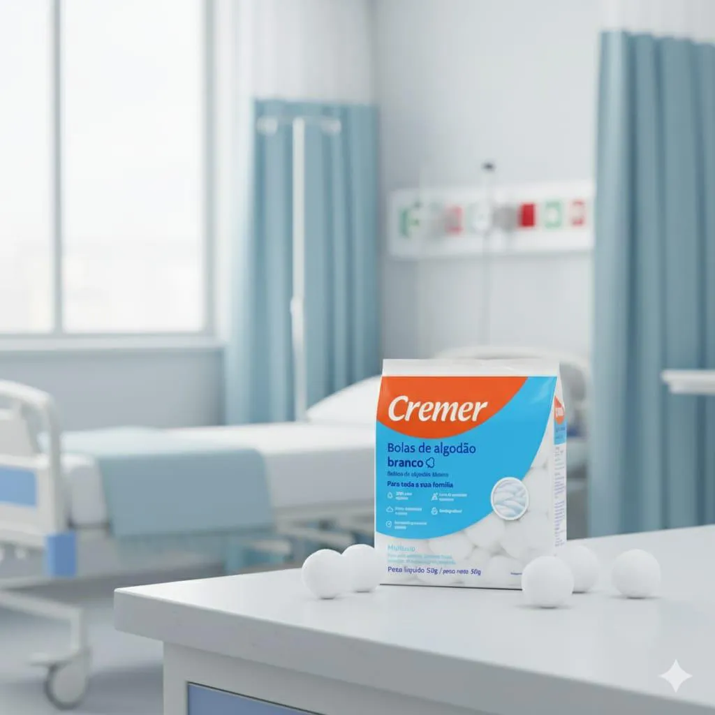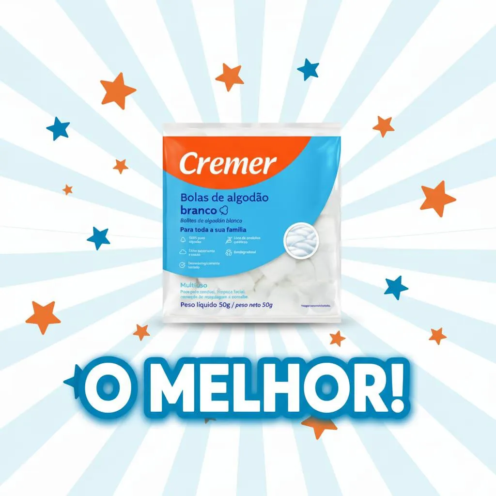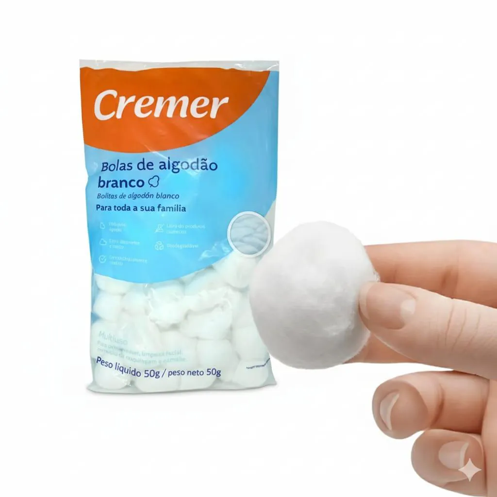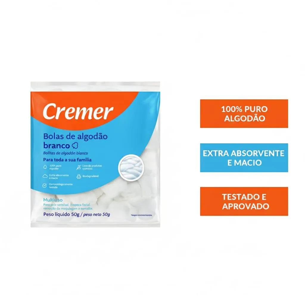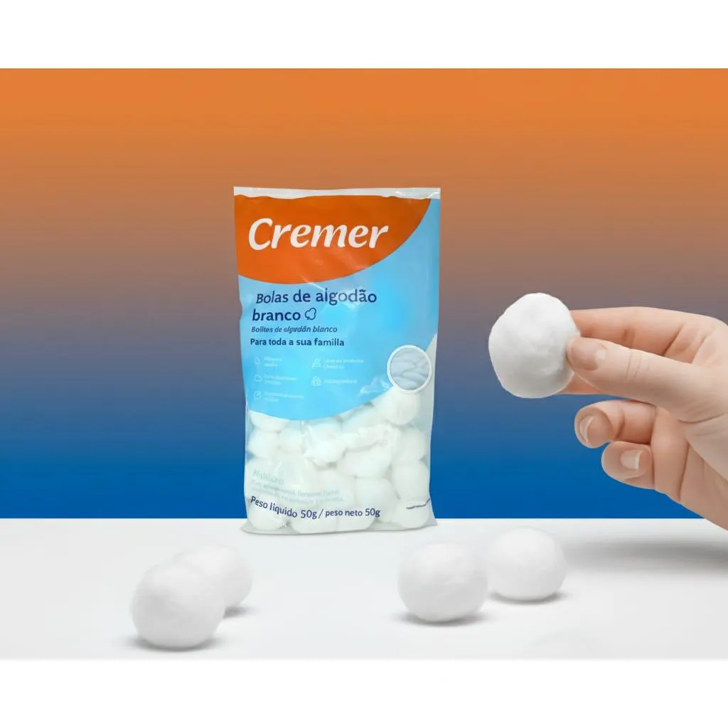 algodão 50 G BOLAS DE ALGODÃO BRANCO PACOTE 50 G As bolas de algodão Cremer são isentas de impurezas , macias e extra-absorventes , devido ao tratamento especial dado as fibras do algodão. Indicado para higiene de todos os tipos de pele. Também são recomendados para remoção de maquiagem e esmalte. Composição 100% algodão O Fabricante recomenda uso único. Conservar em local limpo, fresco, seco e ventilado. DICA: MANTENHA SEMPRE SEM CASA UM KIT DE primeiros socorros PARA TODOS OS CUIDADOS.