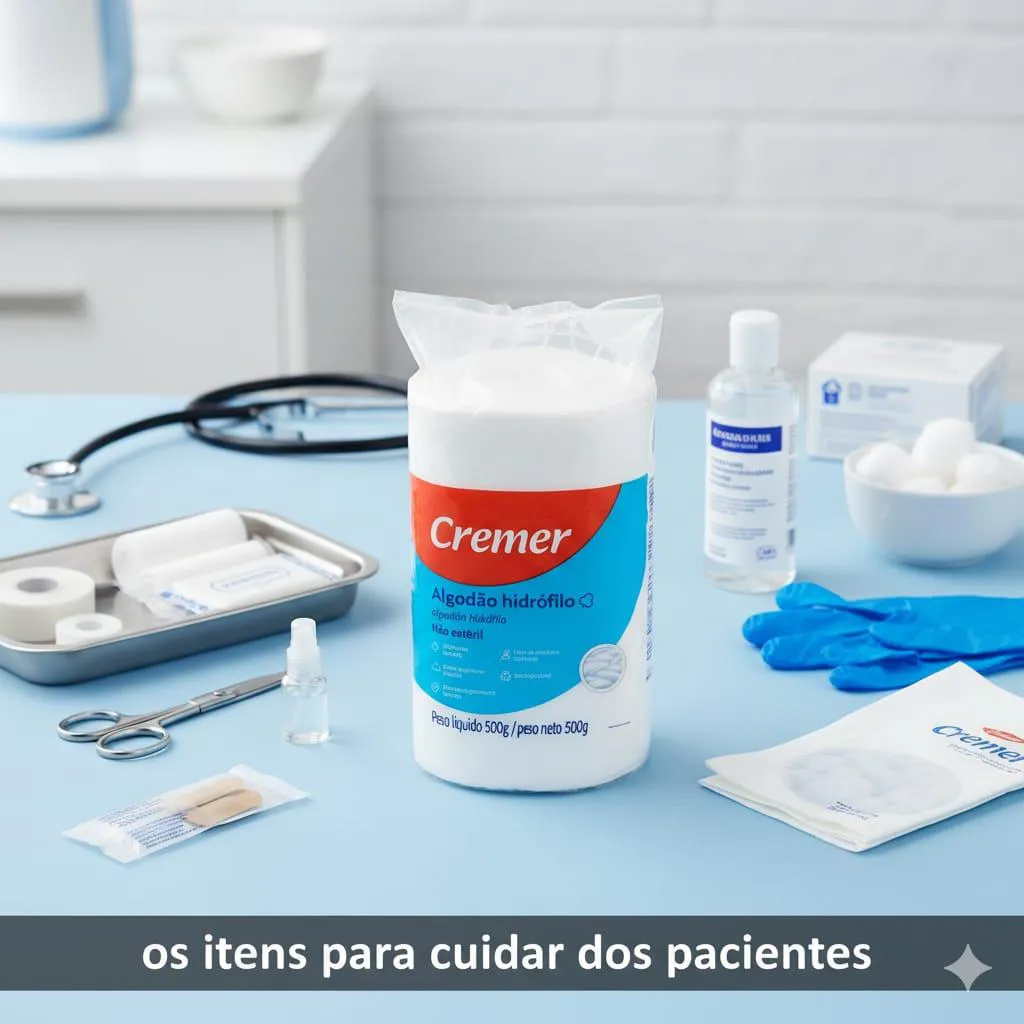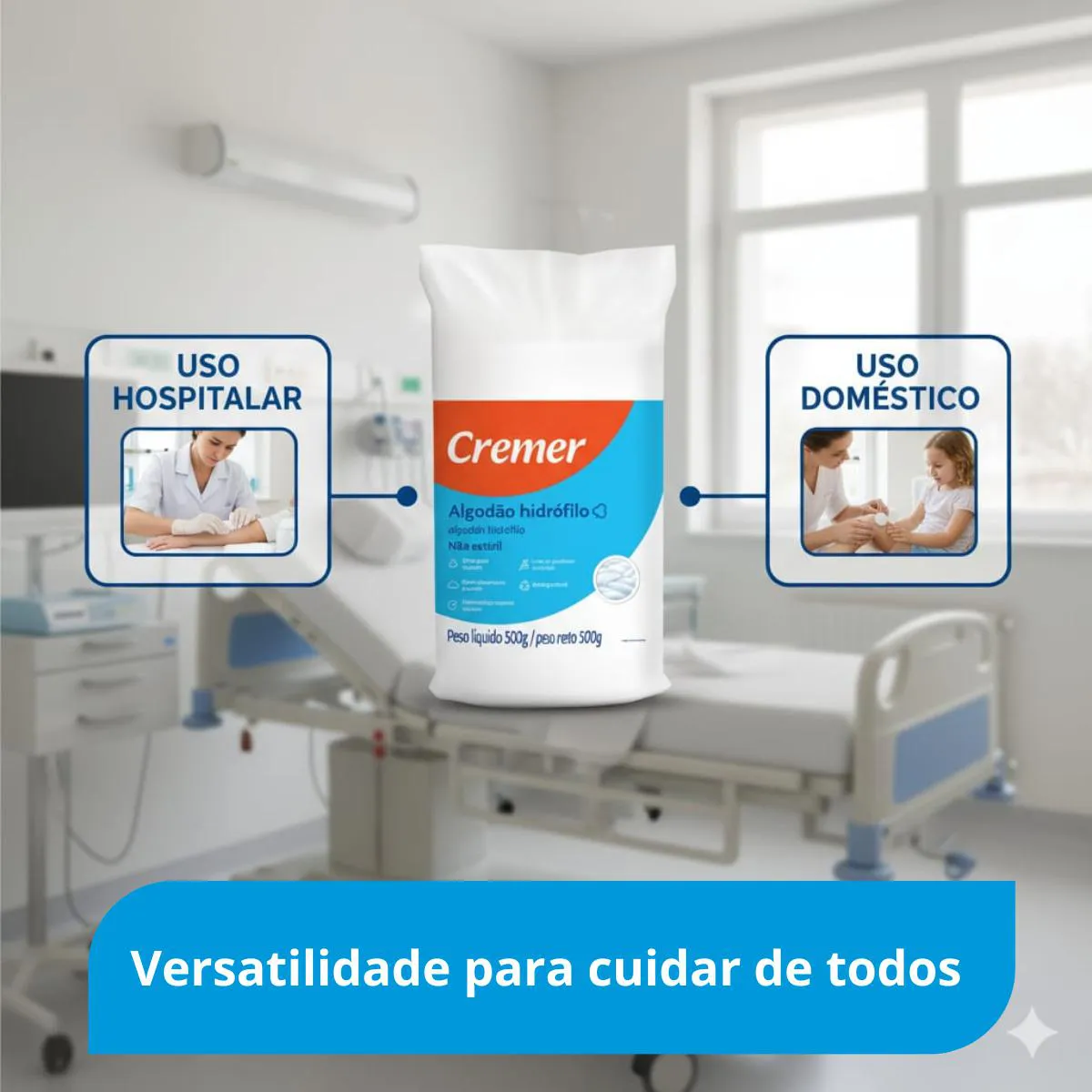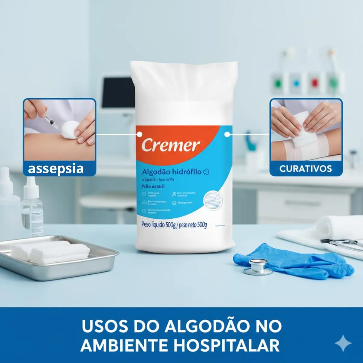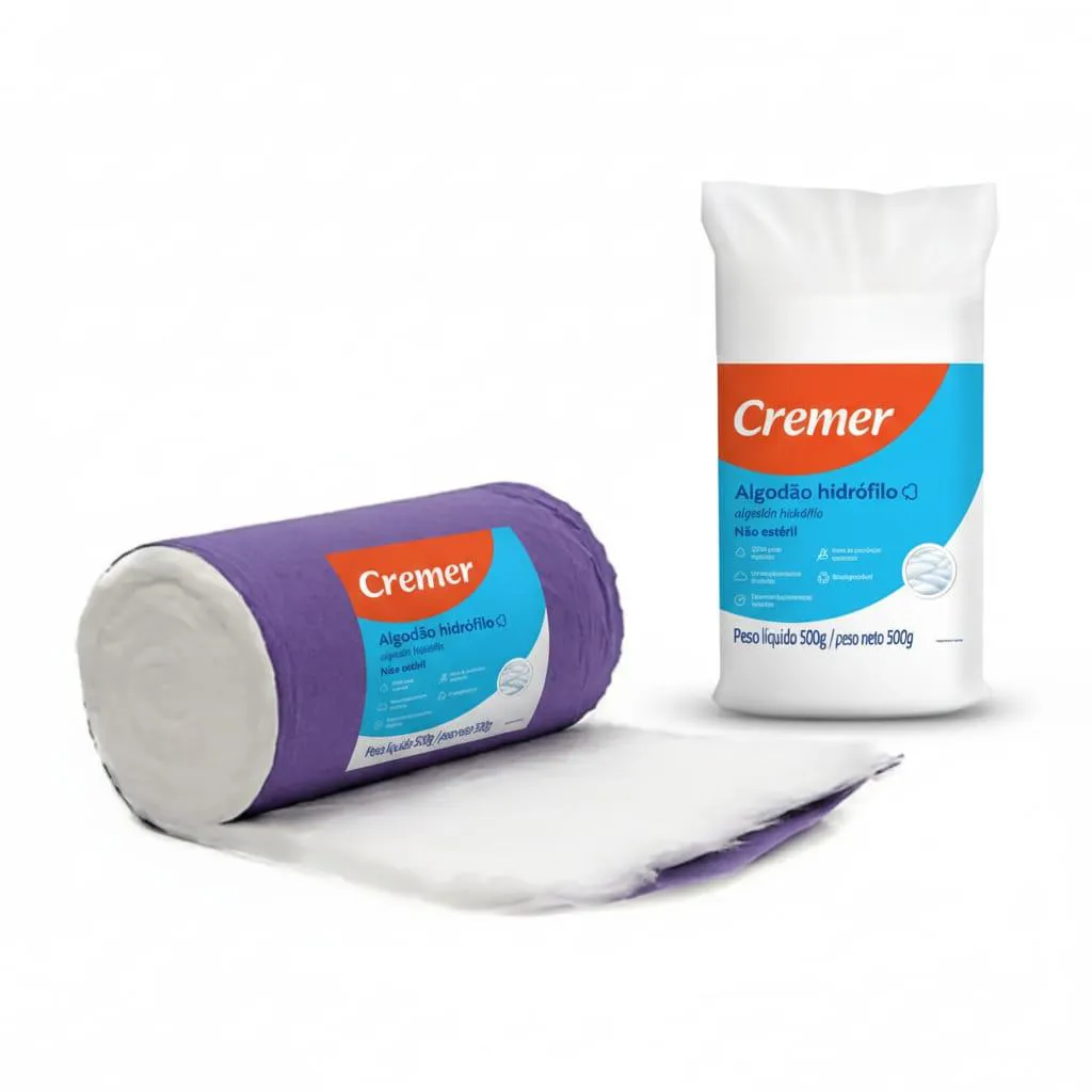 algodão HIDRÓFILO ROLO CREMER 500 G O Algodão Hidrófilo em rolo Cremer é isento de impurezas, macio e extra-absorvente, devido ao tratamento especial dados as fibras de algodão. Indicado para o cuidado e higiene de todos os tipos de pele, assepsia e curativos em uso doméstico e hospitalar. Produto Não estéril. Composição: 00 % algodão O fabricante recomenda uso único. Conservar em local Limpo , fresco e ventilado