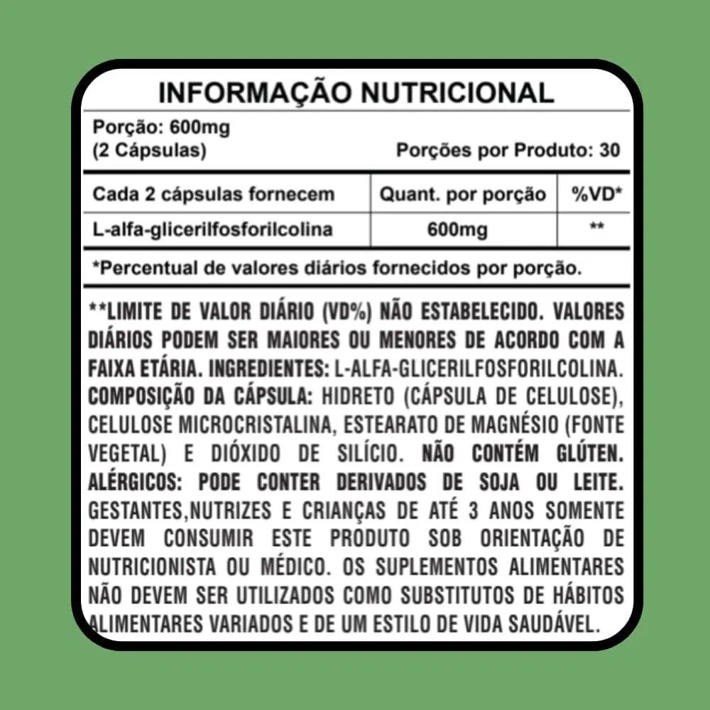 Ingredientes: L-Alfa-Glicerilfosforilcolina Composição da cápsula: Hidreto (cápsula de celulose), celulose microcristalina, estearato de magnésio (fonte vegetal) e dióxido de silício. Recomendação de uso: Tomar duas cápsulas ao dia antes das principais refeições. Rende 30 doses. NÃO CONTÉM GLÚTEN. ALÉRGICOS: PODE CONTER DERIVADOS DE SOJA OU LEITE. Produto isento de registro conforme RDC 240/2018