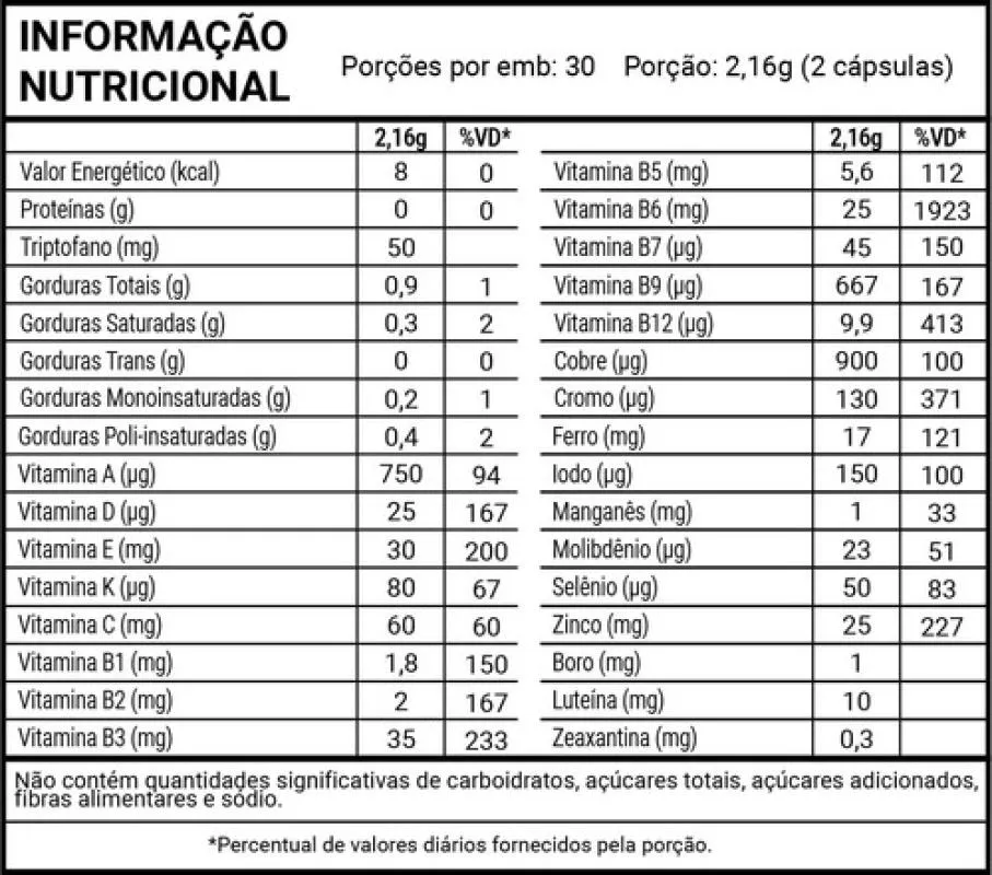 Óleo de coco, magnésio bisglicinato, óleo de borragem, óleo de prímula, zinco bisglicinato, azeite de oliva, ferro bisglicinato, ascorbato de cálcio, L-triptofano, luteína da flor de Tagetes erecta, D-alfa tocoferol, nicotinamida, fosfato de piridoxal, D-pantenol, tetraborato de sódio decahidratado, cobre bisglicinato, selenometionina, menaquinona-7 (vitamina K2), palmitato de retinol, riboflavina-5'-fosfato de sódio, cloridrato de tiamina, picolinato de cromo, sulfato de manganês monohidratado, L-metilfolato de cálcio, iodeto de potássio, D-biotina, fitomenadiona (vitamina K1), colecalciferol, molibdato de sódio dihidratado, metilcobalamina e emulsificante lecitina de girassol.Composição da Cápsula: Gelatina, água purificada, umectante glicerina e corante natural clorofila.