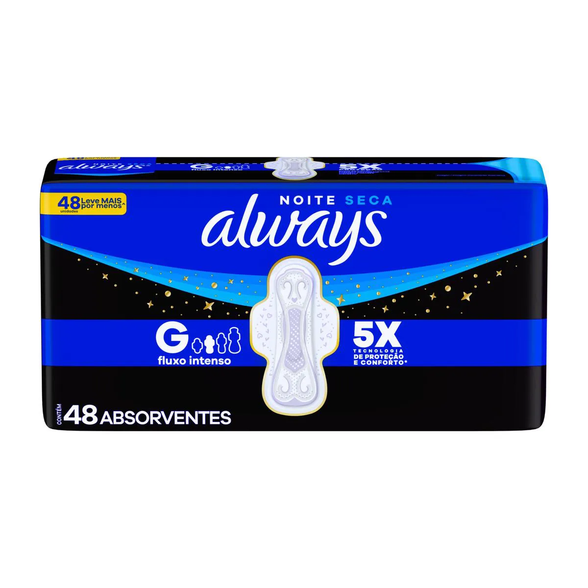 O Absorvente Always Noite Seca com Abas é um produto com cobertura seca, formato ideal com centro elevado que se ajusta perfeitamente ao corpo, contendo tecnologia Odor Stop para eliminação de odores e abas para maior segurança. Serve para proporcionar conforto e tranquilidade para mulheres, especialmente durante a noite, com um formato hiper longo 4 cm maior que absorventes comuns, garantindo proteção máxima durante o sono.