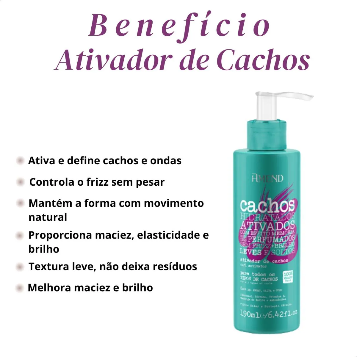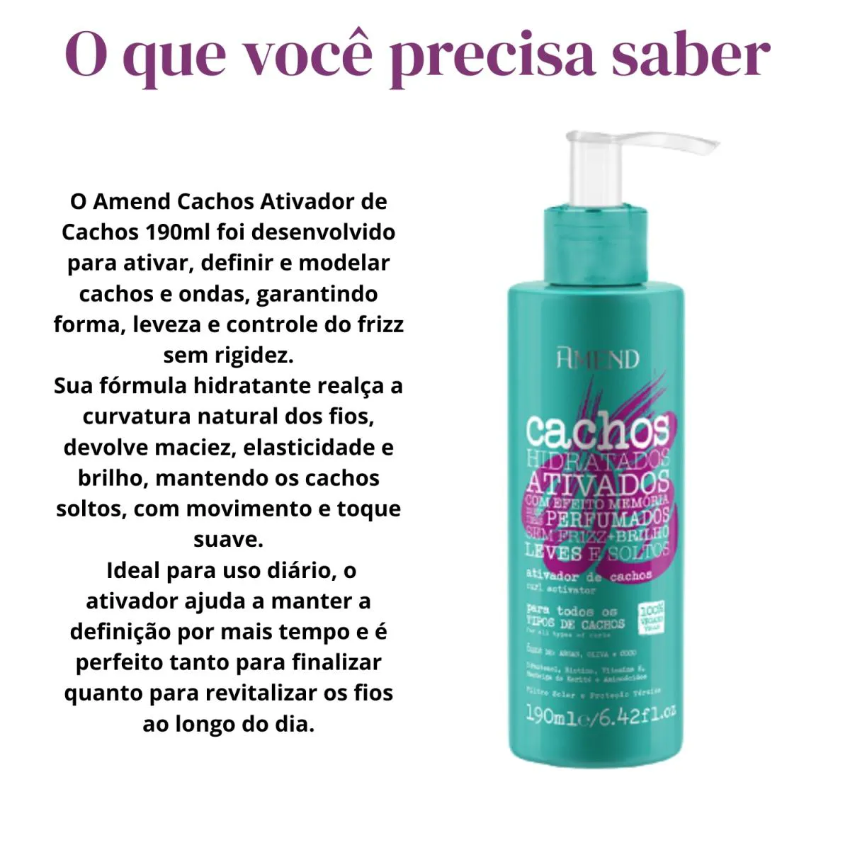 Indicado para todos os tipos de cachos e ondas, o ativador atua realçando a forma natural dos fios, proporcionando definição equilibrada, controle do frizz e toque macio, sem rigidez ou aspecto pesado.