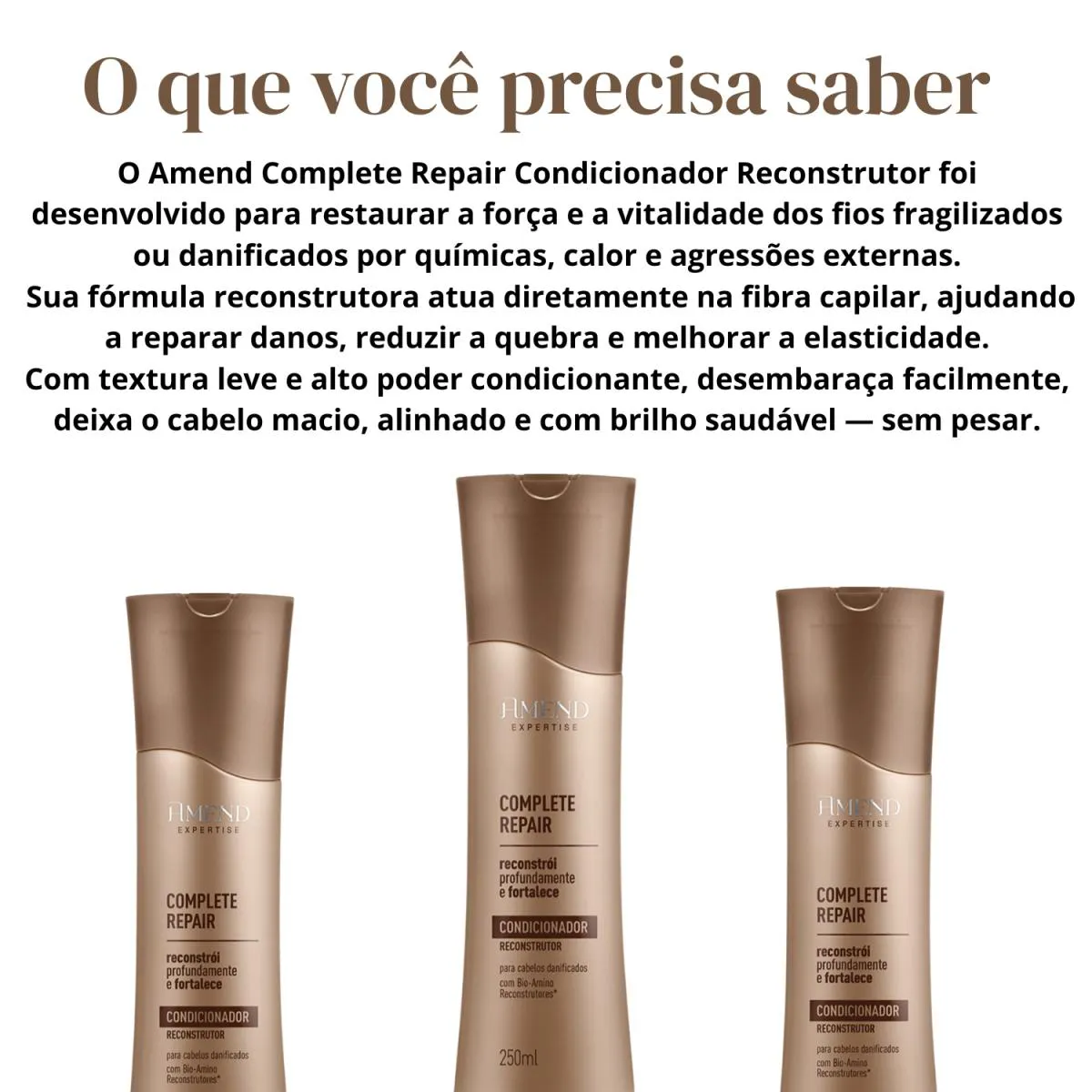 *** Loja Oficial beleza Marcante *** A Beleza Marcante Cosméticos é uma loja virtual que, há mais de 8 anos, cuida com carinho da beleza de pessoas modernas e atualizadas. Com um olhar atento, buscamos oferecer produtos inovadores que realçam a beleza natural e promovem o bem-estar. ESTOQUE DISPONÍVEL – ENVIO IMEDIATO APÓS CONFIRMAÇÃO DA COMPRA – ENVIAMOS PARA TODO BRASIL - COM NOTA FISCAL - TODAS AS FOTOS SÃO REAIS – DIRETO DA FÁBRICA. -Loja Oficial na plataforma -Mais de 8 anos entre os melhores vendedores nos Marketplaces -Variedade completa de produtos de qualidade -Atendimento humanizado e especializado -Entrega rápida e segura para todo o Brasil -Fotos reais dos produtos -Compras 100% seguras Este anúncio contém: 1 unidade – Amend Expertise Complete Repair condicionador Reconstrutor 250ml Cabelos danificados por química, calor ou agressões externas perdem força, brilho e resistência — ficando frágeis, porosos e difíceis de pentear. Para recuperar profundamente a fibra capilar, o Condicionador Reconstrutor Amend Complete Repair atua como um tratamento diário de força e reparação. Com Bio-Amino Reconstrutores, o condicionador penetra nas áreas danificadas, repara microfissuras, fortalece os fios e reduz a quebra. Além disso, hidrata intensamente, controla o frizz e devolve vitalidade, brilho e maciez sem pesar. Com o uso contínuo, o cabelo ganha resistência, suavidade e proteção contra novos danos. -Reconstrução da fibra capilar. -Reduz a quebra e aumenta a resistência. -Hidrata intensamente e reduz o frizz. -Melhora textura, brilho e vitalidade dos fios. -Ação desembaraçante sem pesar. -Blindagem contra agressões externas (calor, química e poluição). -Com Bio-Amino Reconstrutores. -Dermatologicamente testado. Modo de usar: - Aplicar nos cabelos molhados após o shampoo ou máscara. - Massagear suavemente do comprimento às pontas. - Evitar aplicar na raiz. - Enxaguar bem. - Para melhor resultado, utilizar a linha completa Amend Complete Repair. Conservação e cuidados: - Mantenha fora do alcance de crianças. - Conservar em local fresco e ao abrigo de luz intensa. - Não ingerir. - Em caso de contato com os olhos, enxaguar com água abundante. - Uso externo. Perguntas Frequentes (FAQ) 1. Ele pesa nos fios? Não. A fórmula reconstrutora hidrata sem deixar o cabelo pesado. 2. Serve para cabelos quebradiços? Sim. Indicado para fios frágeis, danificados por química, calor ou agressões externas. 3. Pode usar diariamente? Pode sim. A fórmula é equilibrada para uso diário. 4. Pode ser usado em cabelos lisos ou cacheados? Sim, qualquer tipo de cabelo que esteja danificado pode usar. 5. Ajuda no frizz? Sim. O condicionador cria uma camada protetora que reduz frizz e melhora a textura do fio. ATENÇÃO! Não aceitamos devoluções de produtos usados. Pedimos, por gentileza, que verifique todas as informações antes de finalizar sua compra. Estamos à disposição para esclarecer qualquer dúvida na área de perguntas do anúncio. Será um prazer atendê-lo(a)! BELEZA MARCANTE COSMÉTICOS.