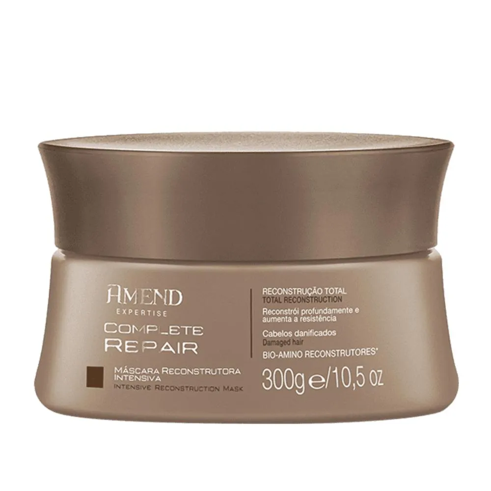 Máscara de reconstrução para cabelos danificados. Amend Complete Repair Máscara Reconstrutora Intensiva repara os danos, aumenta a resistência e protege das agressões externas.
