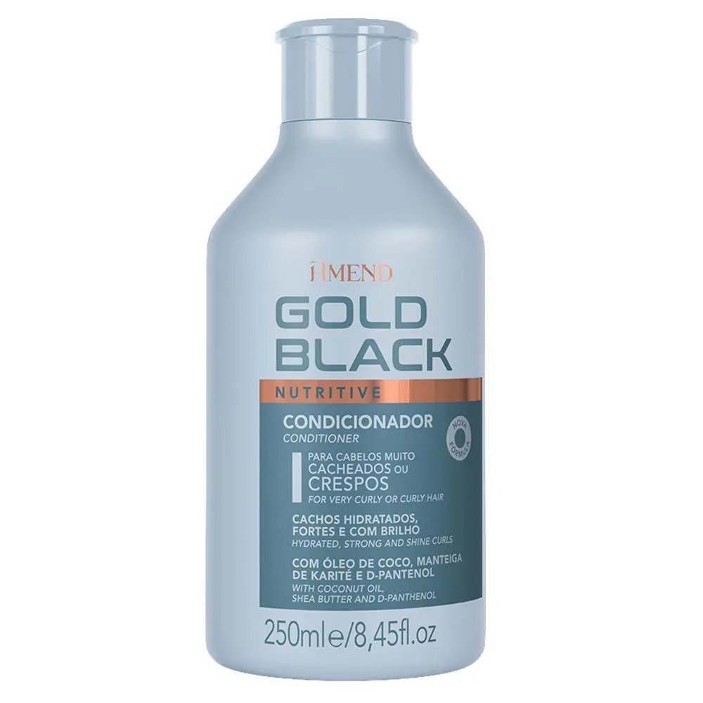 condicionador Nutritivo Amend Gold Black Nutritivo - O Condicionador Nutritivo Amend Gold Black foi formulado com ativos essenciais para um condicionamento intenso dos fios, garantindo hidratação na medida certa para o cachos e ajudando a reduzir o volume. Sua fórmula enriquecida com ativos emolientes fortalece e diminui a porosidade dos fios, proporcionando maior maciez, brilho e suavidade ao cabelo.