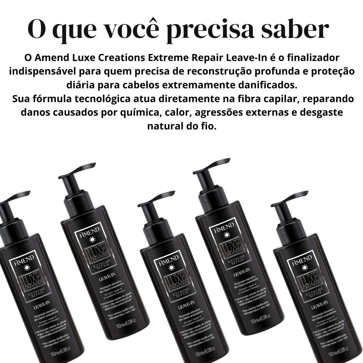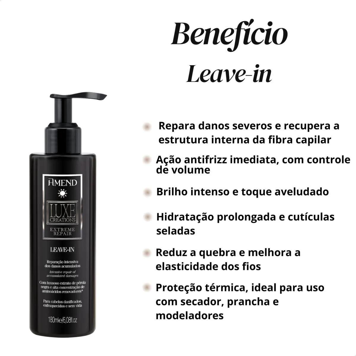 *** Loja Oficial beleza Marcante *** A Beleza Marcante Cosméticos é uma loja virtual que, há mais de 8 anos, cuida com carinho da beleza de pessoas modernas e atualizadas. Com um olhar atento, buscamos oferecer produtos inovadores que realçam a beleza natural e promovem o bem-estar. ESTOQUE DISPONÍVEL – ENVIO IMEDIATO APÓS CONFIRMAÇÃO DA COMPRA – ENVIAMOS PARA TODO BRASIL - COM NOTA FISCAL - TODAS AS FOTOS SÃO REAIS – DIRETO DA FÁBRICA. -Loja Oficial na plataforma -Mais de 8 anos entre os melhores vendedores nos Marketplaces -Variedade completa de produtos de qualidade -Atendimento humanizado e especializado -Entrega rápida e segura para todo o Brasil -Fotos reais dos produtos -Compras 100% seguras Este anúncio contém: 1 unidade Leave-In Amend Luxe Creations Extreme Repair 180ml – Ref. 1301 O Leave-In Amend Luxe Creations Extreme Repair 180ml é o aliado perfeito para quem precisa restaurar profundamente cabelos danificados, enfraquecidos, opacos ou sem vida. Ele atua como um tratamento de reparação intensiva, devolvendo força, brilho e maciez enquanto protege contra danos futuros. Cabelos expostos a químicas, calor, coloração e agressões externas costumam perder massa, ficar mais frágeis e com aparência envelhecida. O Extreme Repair foi desenvolvido para reverter exatamente esses danos — ação imediata e visível já nos primeiros usos. Alta concentração de ativos reparadores: sua fórmula combina aminoácidos renovadores e Extrato de Pérola Negra, que reconstruem profundamente e restauram a fibra capilar. Combate ao envelhecimento capilar: reduz opacidade, quebra e ressecamento, recuperando a vitalidade dos fios. Ação termoativada: protege contra o calor do secador, chapinha e outras ferramentas térmicas. Proteção UV: evita o desbotamento da cor e protege da radiação solar. Brilho intenso e disciplina imediata: os fios ficam mais alinhados, hidratados e com toque sedoso — sem pesar. Reparação contínua durante todo o dia: agindo como um escudo protetor contra frizz e danos externos. Transforme a saúde dos seus cabelos com o Leave-In Extreme Repair 180ml. Reconstrução profunda, brilho e proteção para todos os dias. Adicione ao carrinho e experimente uma finalização luxuosa com resultado profissional! Modo de usar: Após lavar os cabelos com shampoo e condicionador da linha Extreme Repair, aplique o leave-in sobre os fios úmidos. Distribua no comprimento e pontas, evitando a raiz. Não enxaguar. Finalize como desejar — com secador, chapinha ou natural (com proteção térmica garantida). Como conservar: Mantenha a embalagem bem fechada. Conservar em local fresco, ao abrigo da luz solar. Evitar deixar água dentro do frasco. Descartar caso haja alteração de odor, cor ou textura. Perguntas Frequentes (FAQ) 1 – Pode ser usado todos os dias? Sim! É um leave-in de tratamento diário que fortalece e repara continuamente. 2 – Serve para cabelos com química? Serve perfeitamente — especialmente para cabelos danificados por tintura, descoloração, escova progressiva, chapinha ou ressecamento extremo. 3 – Pode usar antes do secador ou chapinha? Sim, ele possui ação termoativada, protegendo contra altas temperaturas. 4 – Pesa nos fios? Não. A fórmula condicionante hidrata e disciplina sem deixar sensação pesada. 5 – Ajuda contra o desbotamento da cor? Sim, tem filtro UV que protege os pigmentos e mantém o brilho por mais tempo. ATENÇÃO! Não aceitamos devoluções de produtos usados. Pedimos, por gentileza, que verifique todas as informações antes de finalizar sua compra. Estamos à disposição para esclarecer qualquer dúvida na área de perguntas do anúncio. Será um prazer atendê-lo(a)! BELEZA MARCANTE COSMÉTICOS.