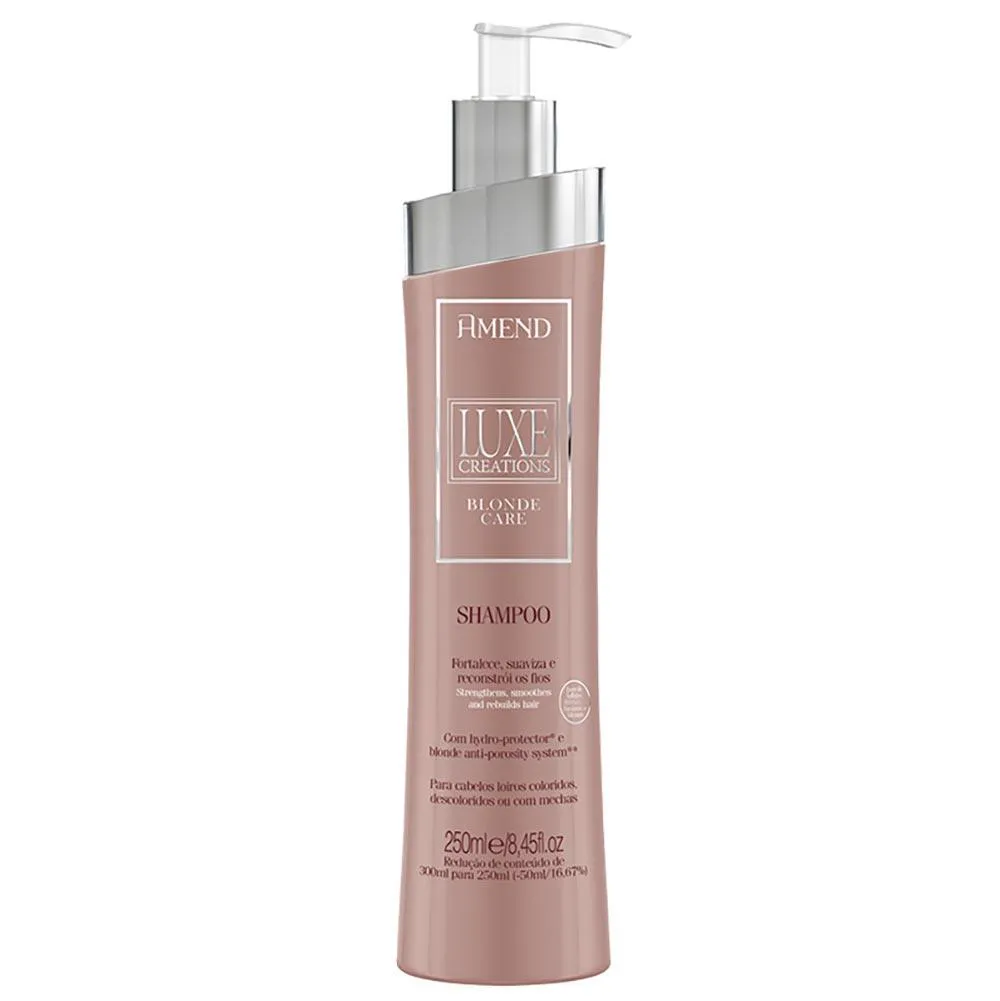 shampoo Amend Luxe Creations Blonde Care Formulado com o exclusivo Blonde Anti-porosity System, cuida dos cabelos descoloridos que foram agredidos por processos químicos causadores dos profundos danos na estrutura dos fios.
