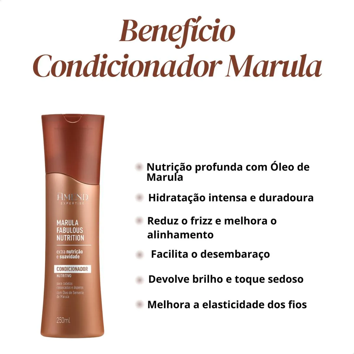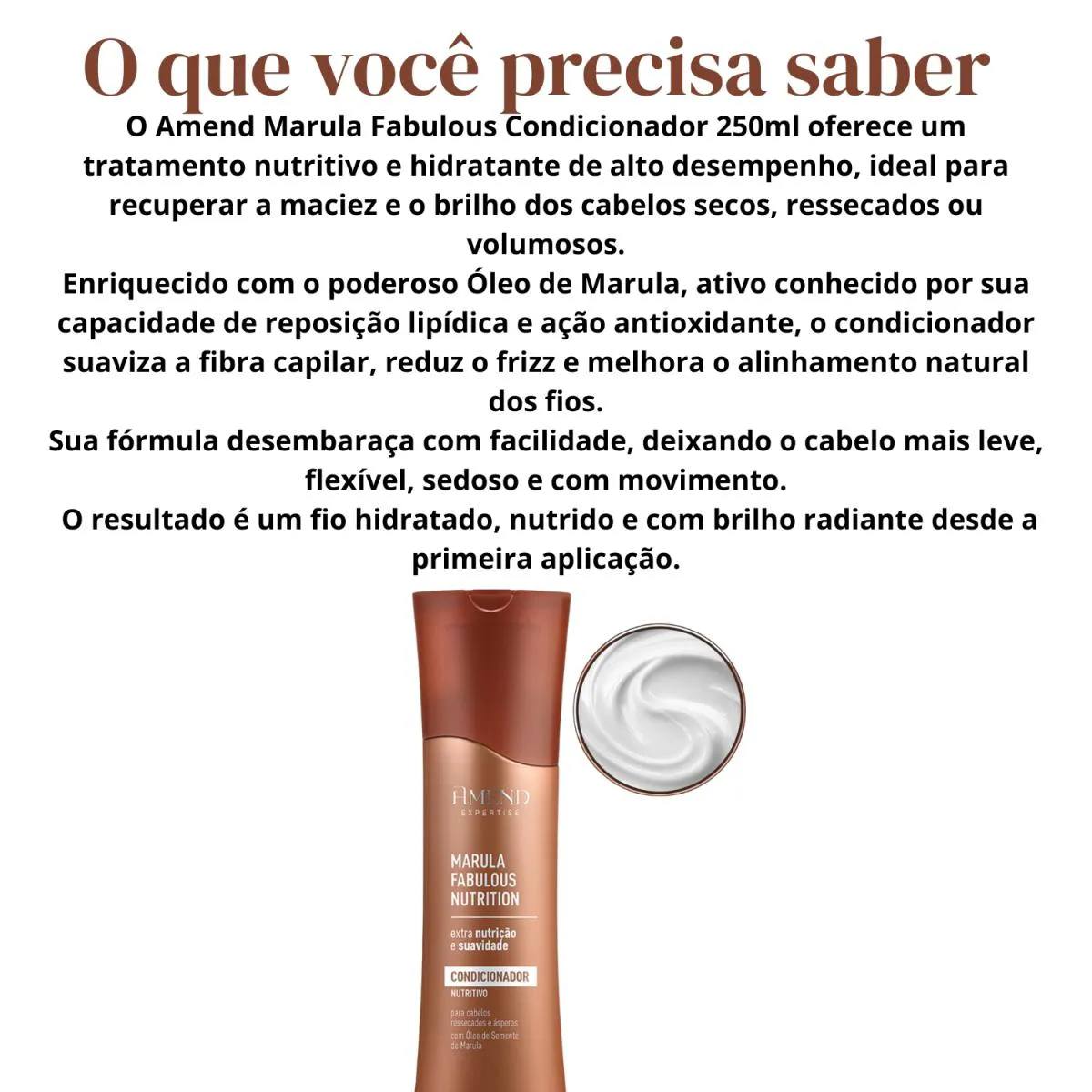 *** Loja Oficial beleza Marcante *** A Beleza Marcante Cosméticos é uma loja virtual que, há mais de 8 anos, cuida com carinho da beleza de pessoas modernas e atualizadas. Com um olhar atento, buscamos oferecer produtos inovadores que realçam a beleza natural e promovem o bem-estar. ESTOQUE DISPONÍVEL – ENVIO IMEDIATO APÓS CONFIRMAÇÃO DA COMPRA – ENVIAMOS PARA TODO BRASIL - COM NOTA FISCAL - TODAS AS FOTOS SÃO REAIS – DIRETO DA FÁBRICA. -Loja Oficial na plataforma -Mais de 8 anos entre os melhores vendedores nos Marketplaces -Variedade completa de produtos de qualidade -Atendimento humanizado e especializado -Entrega rápida e segura para todo o Brasil -Fotos reais dos produtos -Compras 100% seguras Este anúncio contém: 1 unidade — condicionador Nutritivo Amend Expertise Marula Fabulous Nutrition 250ml Para cabelos ásperos, ressecados ou com perda de oleosidade natural, o Condicionador Nutritivo Amend Marula Fabulous Nutrition devolve nutrição, maciez e suavidade logo na primeira aplicação. Sua fórmula rica em Óleo de Semente de Marula, vitamina e e agentes termoprotetores condiciona profundamente, melhora a penteabilidade e repõe a maciez perdida — tudo sem pesar nos fios. Além disso, cria uma barreira protetora que preserva a hidratação e impede o ressecamento causado pelo uso frequente de secador, prancha e outras fontes de calor. O resultado são cabelos nutridos, macios, brilhantes e com toque suave Extra nutrição e suavidade para cabelos secos e ásperos. Condicionamento imediato com toque macio e sedoso. Fios totalmente hidratados sem pesar. Contém vitamina E, que protege, hidrata e combate danos externos. Termoproteção: preserva a hidratação mesmo com uso de calor. Melhora a penteabilidade e reduz o frizz Modo de usar Após o shampoo ou após a máscara, aplique o condicionador nos fios úmidos. Evite a raiz. Massageie suavemente e deixe agir por alguns instantes. Enxágue bem. Conservação Manter em local fresco, longe da luz intensa. Evitar contato com os olhos. Não ingerir. Uso externo. Perguntas Frequentes (FAQ) 1. O condicionador pesa nos fios? Não — a fórmula é nutritiva, porém leve, ideal para cabelos ressecados. 2. Pode ser usado diariamente? Sim, é um condicionador de uso diário. 3. Ajuda no frizz? Sim, melhora a disciplina dos fios e reduz o frizz. 4. Tem cheiro forte? Possui fragrância suave e agradável. 5. É liberado para low poo? Não, pois contém silicones. ATENÇÃO! Não aceitamos devoluções de produtos usados. Pedimos, por gentileza, que verifique todas as informações antes de finalizar sua compra. Estamos à disposição para esclarecer qualquer dúvida na área de perguntas do anúncio. Será um prazer atendê-lo(a)! BELEZA MARCANTE COSMÉTICOS.