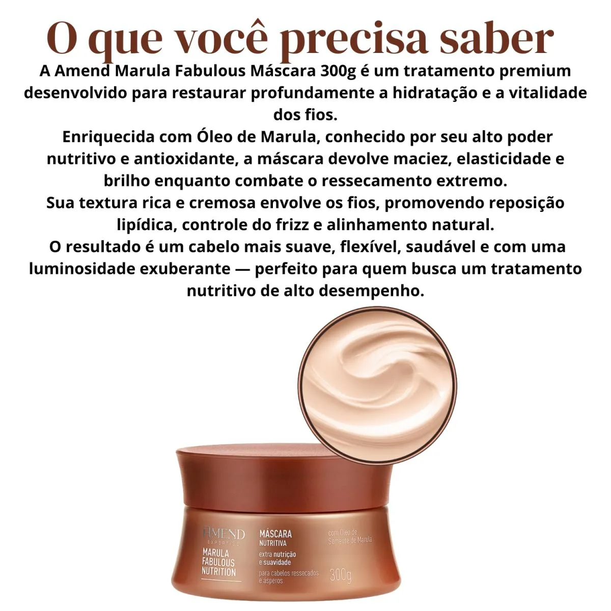 *** Loja Oficial beleza Marcante *** A Beleza Marcante Cosméticos é uma loja virtual que, há mais de 8 anos, cuida com carinho da beleza de pessoas modernas e atualizadas. Com um olhar atento, buscamos oferecer produtos inovadores que realçam a beleza natural e promovem o bem-estar. ESTOQUE DISPONÍVEL – ENVIO IMEDIATO APÓS CONFIRMAÇÃO DA COMPRA – ENVIAMOS PARA TODO BRASIL - COM NOTA FISCAL - TODAS AS FOTOS SÃO REAIS – DIRETO DA FÁBRICA. -Loja Oficial na plataforma -Mais de 8 anos entre os melhores vendedores nos Marketplaces -Variedade completa de produtos de qualidade -Atendimento humanizado e especializado -Entrega rápida e segura para todo o Brasil -Fotos reais dos produtos -Compras 100% seguras Este anúncio contém: 1 unidade — máscara Nutritiva Amend Expertise Marula Fabulous Nutrition 300g Cabelos ressecados, ásperos e sem brilho precisam de um reforço nutritivo — e a Máscara Nutritiva Amend Marula Fabulous Nutrition entrega tudo o que esses fios pedem. Sua fórmula rica em Óleo de Semente de Marula, vitamina e e agentes termoprotetores age profundamente na fibra capilar, devolvendo elasticidade, suavidade, brilho e uma nutrição intensa que não pesa. Enquanto nutre, forma uma barreira protetora contra danos térmicos, evitando que o uso frequente de secador e prancha resseque ainda mais o cabelo. O resultado? Fios macios, hidratados, flexíveis, nutridos e com toque sedoso. Modo de usar Após lavar os cabelos, retire o excesso de água com uma toalha. Aplique a máscara do comprimento às pontas, massageando mecha a mecha. Deixe agir por 3 minutos. Enxágue completamente. Para selagem extra das cutículas, finalize com o condicionador da linha. Conservação Manter em local fresco, longe da luz intensa. Evitar contato com os olhos — caso ocorra, enxaguar imediatamente. Não ingerir. Uso externo. Perguntas Frequentes (FAQ) 1. Para quais tipos de cabelo é indicada? Para fios ressecados, ásperos, rígidos ou com perda de oleosidade natural. 2. Pesa nos fios? Não — a fórmula é nutritiva, porém leve. 3. Pode usar com frequência? Sim, pode ser usada 1–3 vezes por semana, conforme a necessidade dos fios. 4. Possui proteção térmica? Sim — ajuda a preservar a hidratação mesmo com uso de calor. 5. Tem cheiro forte? Não — possui fragrância elegante e suave. ATENÇÃO! Não aceitamos devoluções de produtos usados. Pedimos, por gentileza, que verifique todas as informações antes de finalizar sua compra. Estamos à disposição para esclarecer qualquer dúvida na área de perguntas do anúncio. Será um prazer atendê-lo(a)! BELEZA MARCANTE COSMÉTICOS.