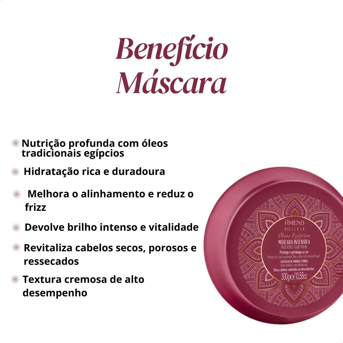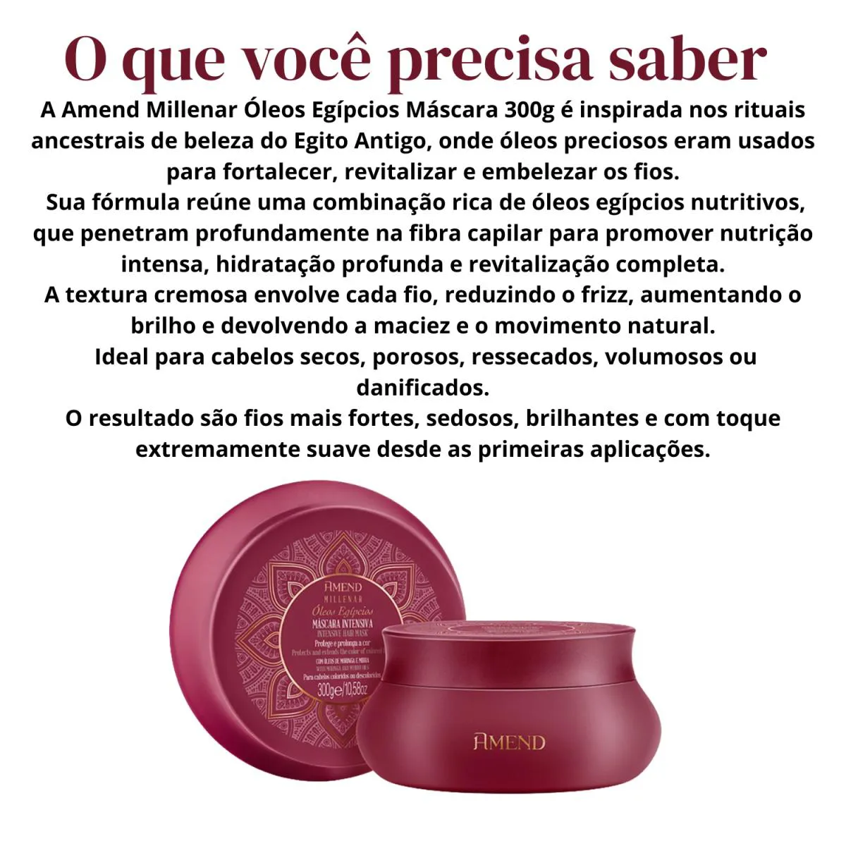 A Amend Máscara Capilar Millenar Óleos Egípcios é uma máscara capilar intensiva inspirada nos rituais de beleza do Egito Antigo, desenvolvida para tratamento capilar profundo. Sua fórmula cremosa combina óleos egípcios nutritivos com tecnologia moderna para cuidar de cabelos.