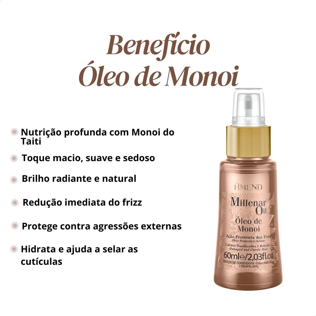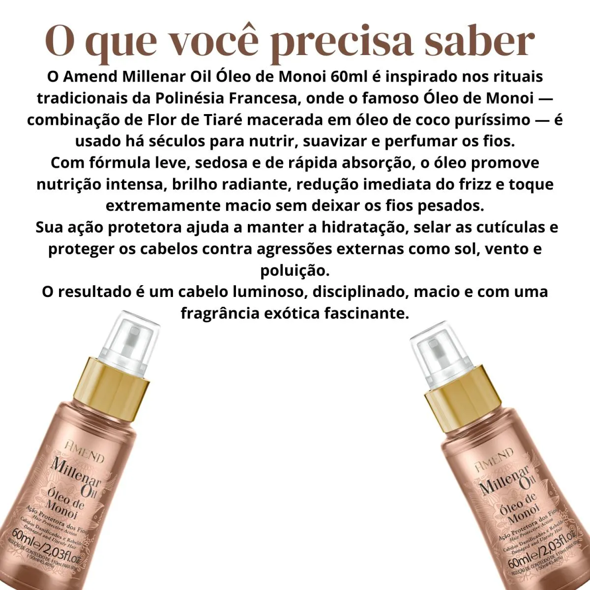 *** Loja Oficial beleza Marcante *** A Beleza Marcante Cosméticos é uma loja virtual que, há mais de 8 anos, cuida com carinho da beleza de pessoas modernas e atualizadas. Com um olhar atento, buscamos oferecer produtos inovadores que realçam a beleza natural e promovem o bem-estar. ESTOQUE DISPONÍVEL – ENVIO IMEDIATO APÓS CONFIRMAÇÃO DA COMPRA – ENVIAMOS PARA TODO BRASIL - COM NOTA FISCAL - TODAS AS FOTOS SÃO REAIS – DIRETO DA FÁBRICA. -Loja Oficial na plataforma -Mais de 8 anos entre os melhores vendedores nos Marketplaces -Variedade completa de produtos de qualidade -Atendimento humanizado e especializado -Entrega rápida e segura para todo o Brasil -Fotos reais dos produtos -Compras 100% seguras Este anúncio contém: 1 unidade – Amend Millenar Oil Óleo de Monoi 60ml – REF 1337 Inspirado nos rituais tradicionais de beleza da Polinésia Francesa, o Óleo Amend Millenar Monoi 60ml traz a combinação ancestral da Flor de Tiaré macerada em óleo de coco puríssimo — um segredo milenar conhecido por nutrir, suavizar e perfumar profundamente os fios. O Óleo de Monoi é famoso por sua capacidade de restaurar o brilho natural, disciplinar o frizz e proporcionar um toque macio, suave e extremamente sedoso sem pesar.