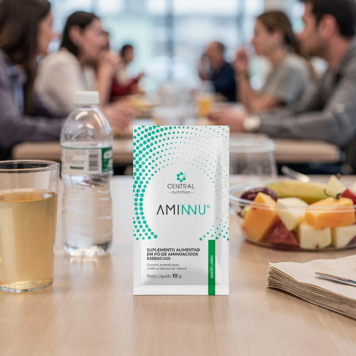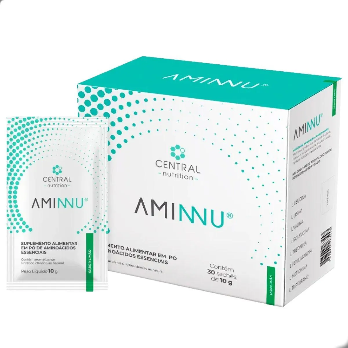 Aminnu é um suplemento de aminoácidos essenciais em sachês individuais de 10 g, projetado para facilitar o consumo dessas moléculas que o organismo não produz. Cada dose contém leucina, isoleucina, valina, lisina, fenilalanina, treonina, metionina e triptofano, adoçada com xilitol e glicosídeo de esteviol e corada com corantes naturais como clorofila. A ausência de lactose e glúten torna o produto adequado para diferentes perfis de consumidores.