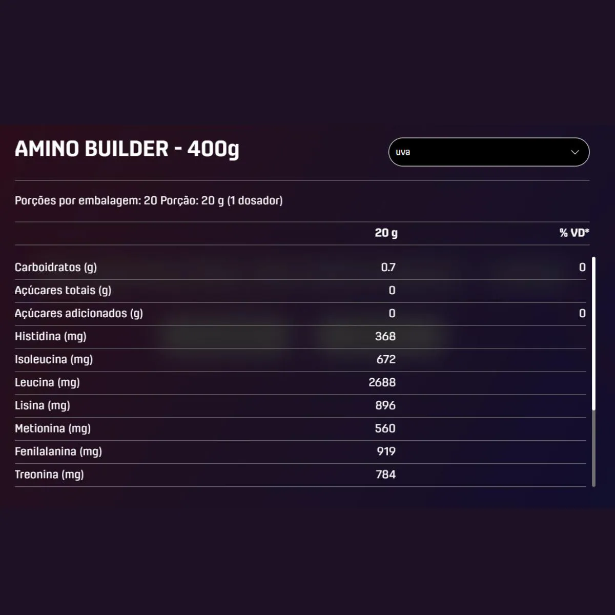 Nosso Aminobuilder é fórmula premium para quem busca maximizar a performance esportiva. Com 10 aminoácidos, incluindo 9 essenciais e 8000 mg de EAAs, este suplemento oferece suporte ideal à síntese proteica. Cada porção fornece 4 g de glutamina, 3 g de creatina e 250 mg de carnitina, otimizando a resistência muscular e acelerando a recuperação. Os aminoácidos são os blocos que formam as proteínas, essenciais para várias funções do organismo. A diferença entre eles está na capacidade do corpo de produzi-los internamente. Aminoácidos essenciais: melhoram a sinalização anabólica durante e após o exercício, as taxas de síntese proteica muscular, diminuição da degradação de proteínas musculares e auxílio na recuperação do exercício. Creatina: proporciona maior força muscular, resistência física, redução no tempo de recuperação, e aumento do volume muscular. Glutamina: auxilia no aumento das reservas de glicogênio muscular, ajudando a evitar que o organismo queime massa muscular para gerar energia. Carnitina: potencial ergogênico – 250mg. Ingredientes: L-Glutamina, creatina monohidratada, L-Leucina, L-Fenilalanina, cloridrato de L-lisina, L-Treonina, L-Isoleucina, L-Valina, L-Metionina, L-triptofano, L-Histidina, tartarato de L-carnitina, regulador de acidez ácido citrico, aromatizantes, antiumectante fosfato tricálcico, edulcorantes taumatina e sucralose e corante extrato de casca de uva. ALÉRGICOS: PODE CONTER TRIGO, AVEIA, AMENDOIM, SOJA, LEITE, AMÊNDOA, AVELÃS, CASTANHA-DE-CAJU E PISTACHES. CONTÉM GLÚTEN. Sugestão de uso: Dissolver em 250ml de água 1 scoop de Amino Builder. Antes ou depois do seu treino.