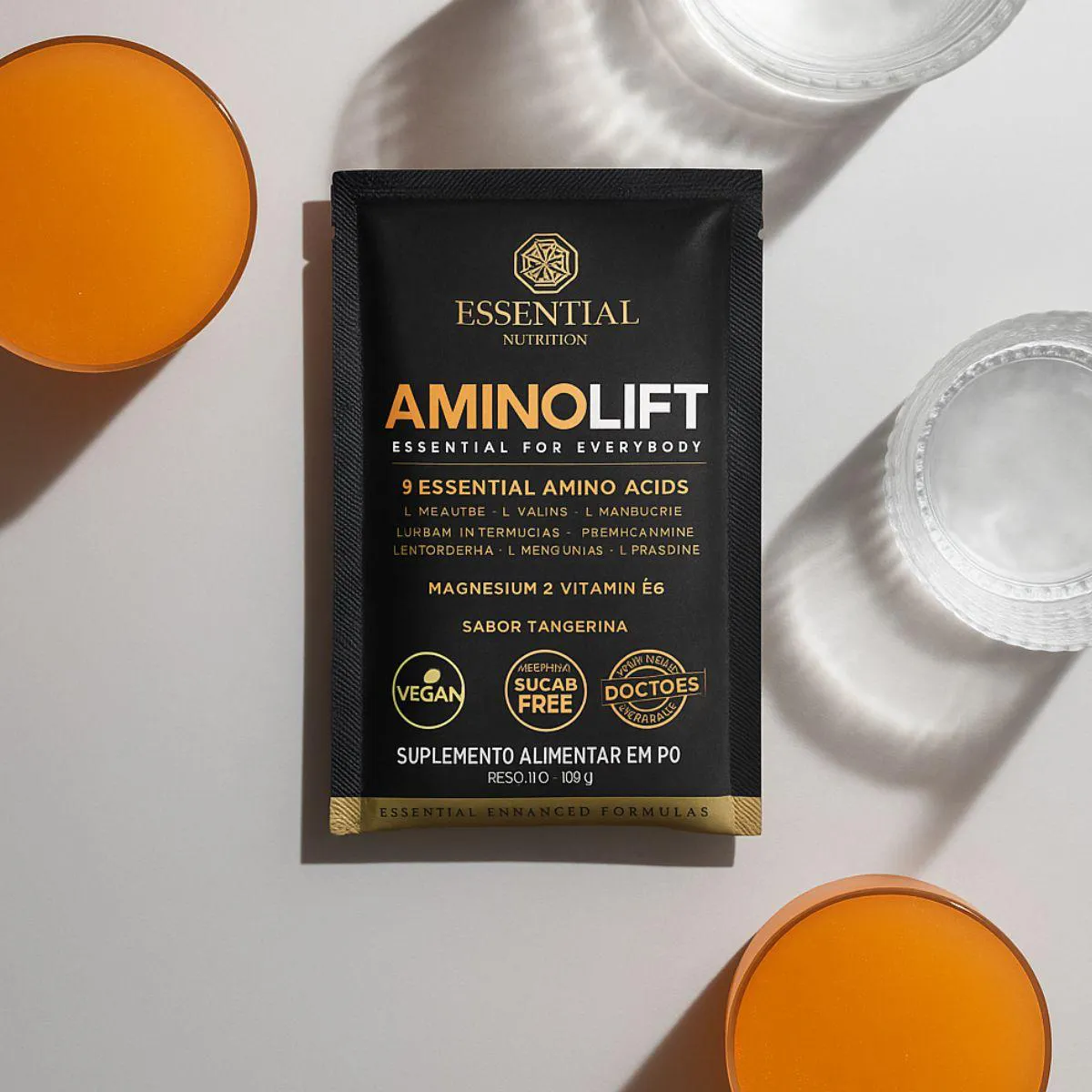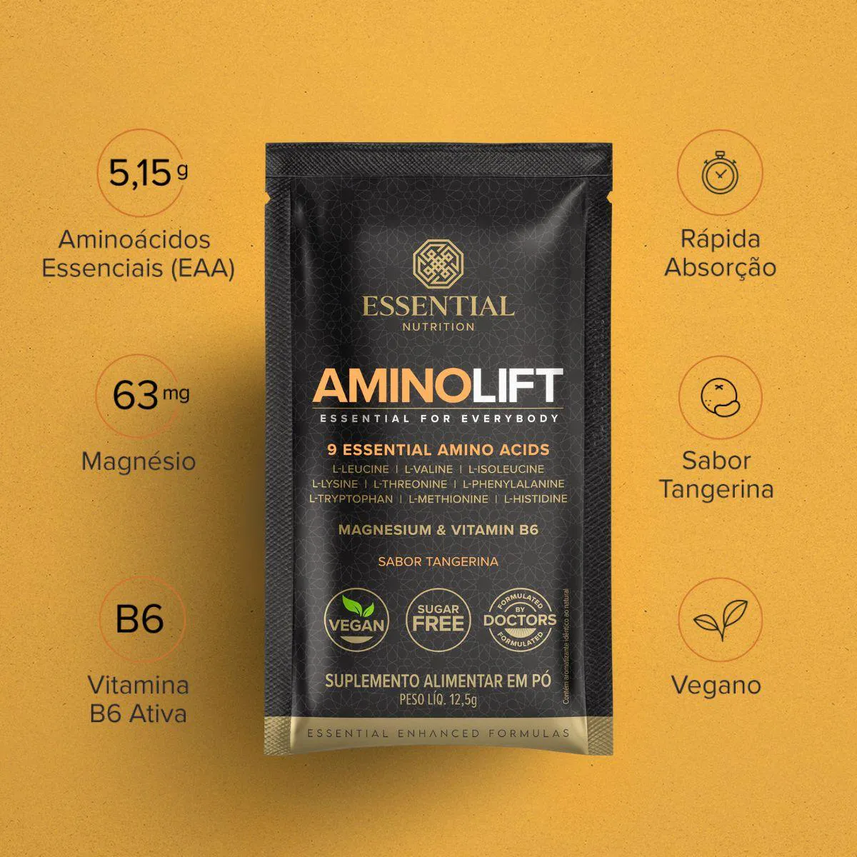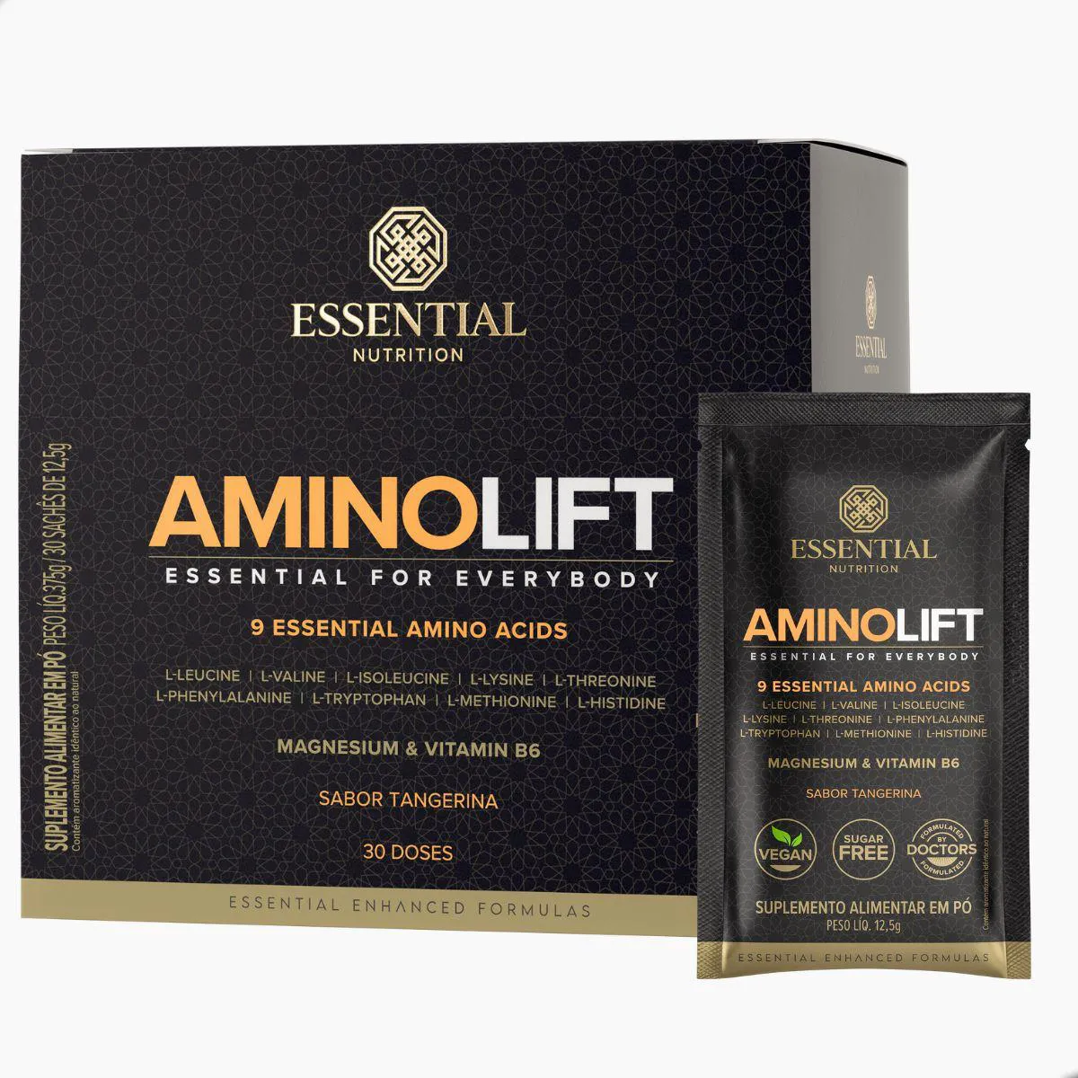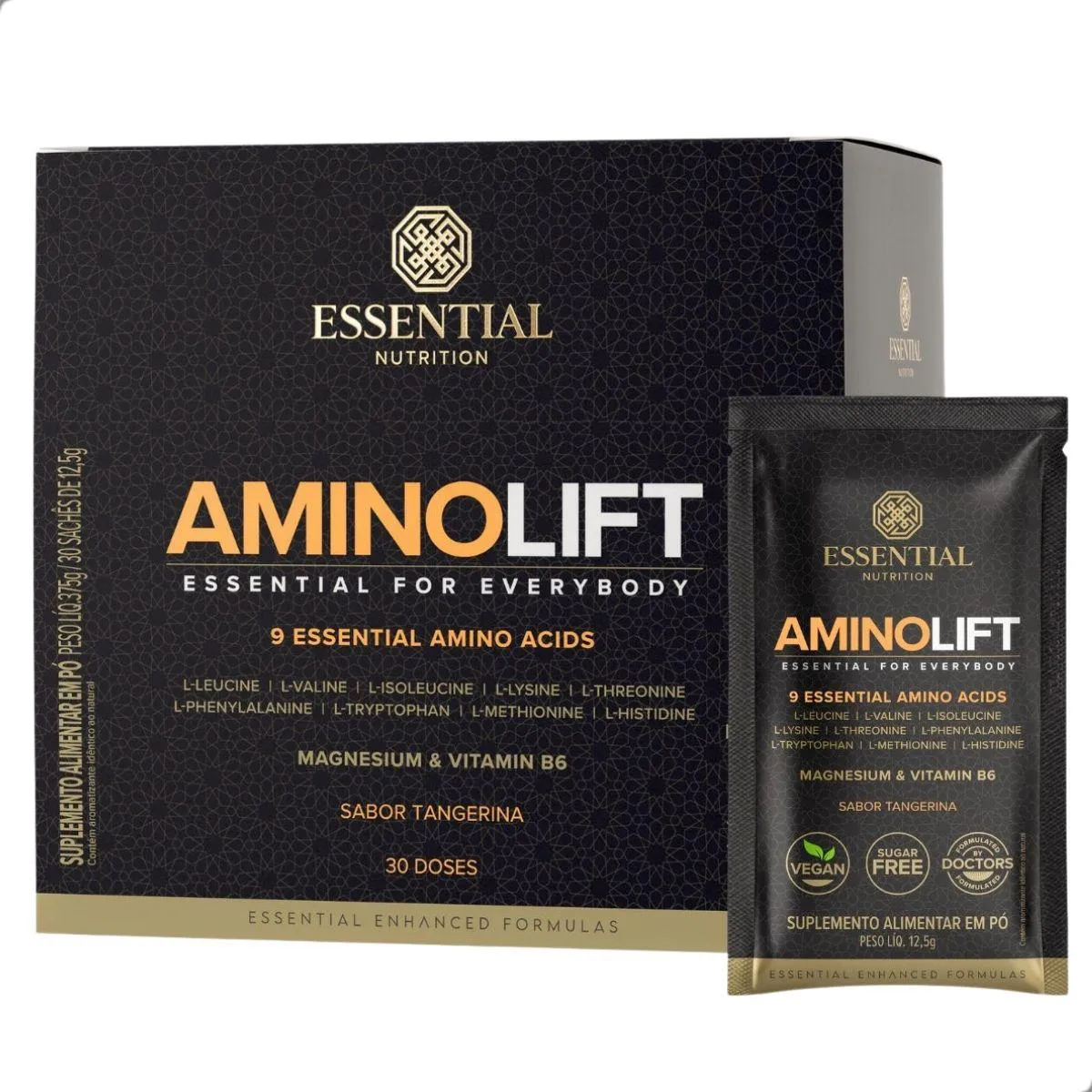 Aminolift Vegano da Essential Nutrition é comercializado em caixa com 30 sachês de 12,5 g cada, totalizando 375 g. Trata-se de uma mistura em pó de aminoácidos desenvolvida especificamente para atender a quem adota dietas plant-based e procura praticidade no consumo de nutrientes.