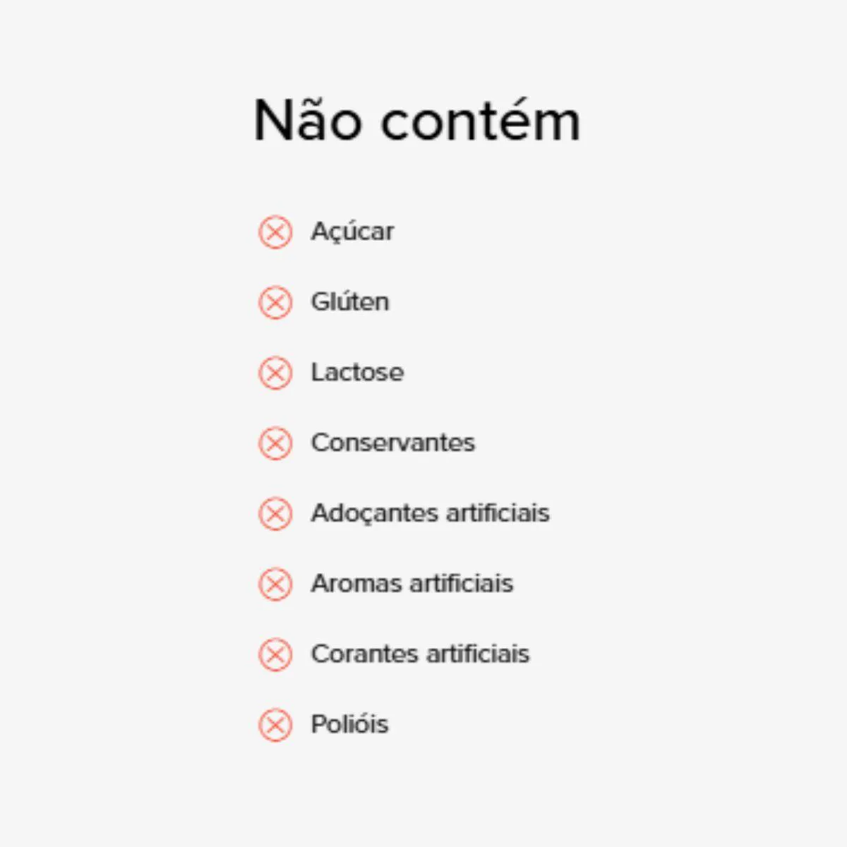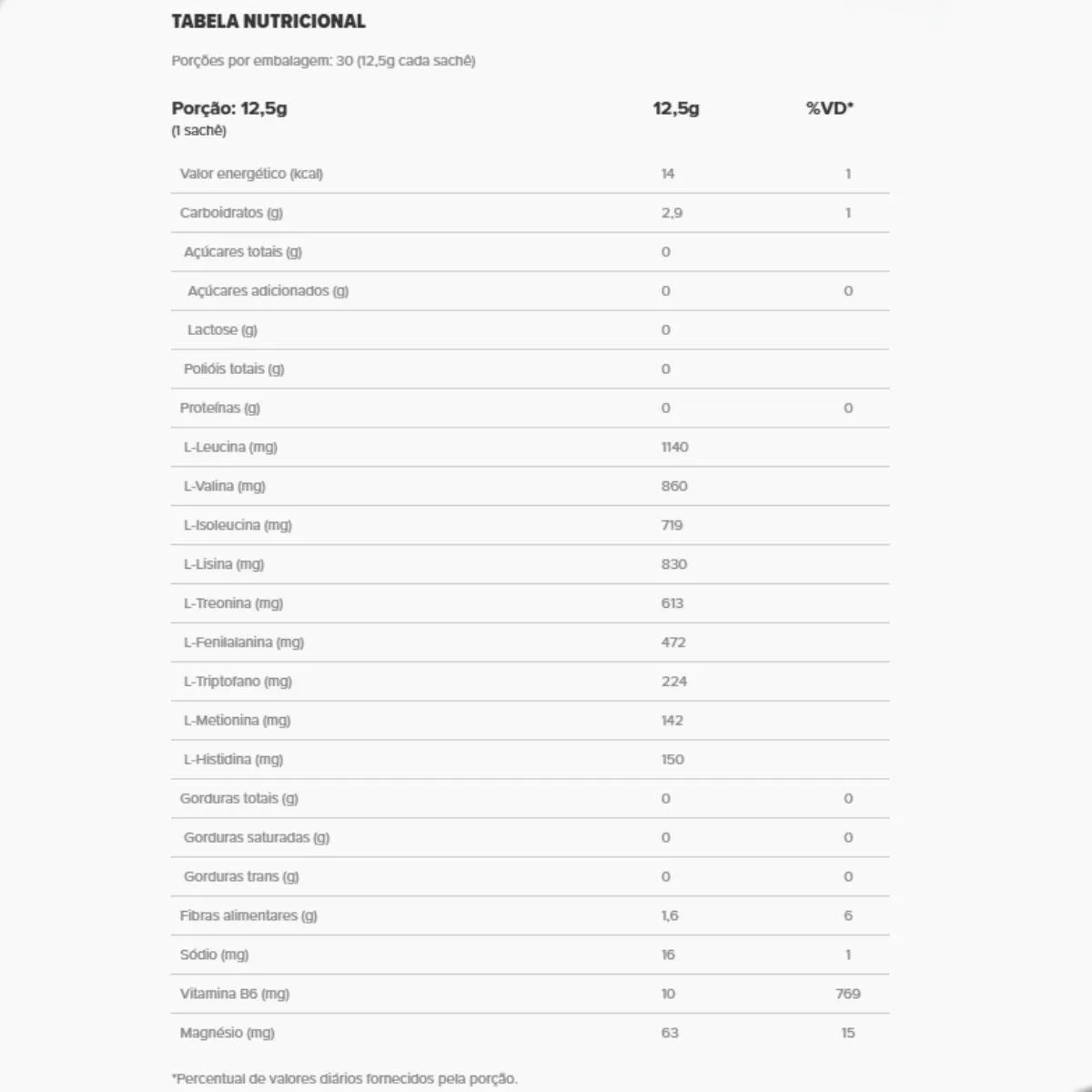 A formulação combina aminoácidos essenciais e não essenciais de origem vegetal, adoçados com fontes naturais e sem adição de açúcar refinado. Não contém glúten, lactose, corantes ou conservantes artificiais. O sabor foi pensado para ser agradável mesmo com a mistura em simples água.