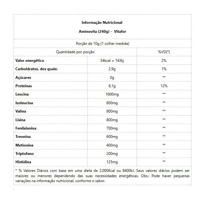 Aminovita (240g) - Vitafor AMINOVITA é um suplemento alimentar composto por 9 aminoácidos de origem vegetal: Leucina, Valina, Isoleucina, Lisina, Fenilalanina, Treonina, Metionina, triptofano e Histidina, com zero adição de açúcares. Os aminoácidos auxiliam na recuperação dos estoques de energia, auxiliam na recuperação muscular e ganho de massa magra. Logo após a prática de atividade física, os músculos precisam de nutrientes para se recuperar e preparar para uma nova sessão de treino. Benefícios:* Aminoácidos de origem vegetal;* Aumenta a imunidade de praticantes de atividades físicas;* Preserva o tecido muscular;* Reduz a fadiga muscular durante treinos intensos;* Melhora a percepção da dor muscular pós-treino;* Auxilia na recuperação muscular após exercícios intensos;* Rápida Absorção;* Vegano;* 6g de aminoácidos por porção;* Baixo em valor energético (baixa caloria);* Não contém açúcar e glúten.