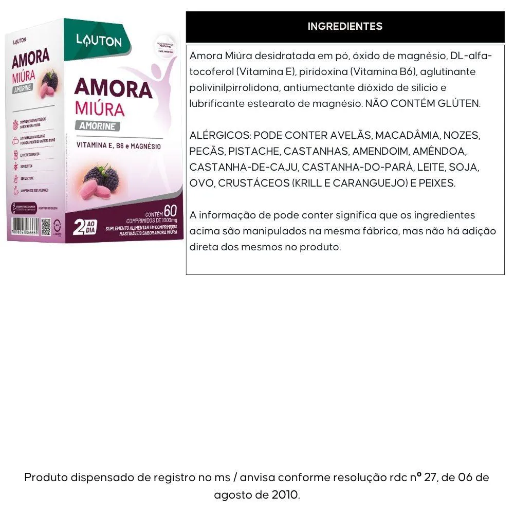Amora Miúra desidratada em pó, óxido de magnésio, DL-alfa-tocoferol (Vitamina E), piridoxina (Vitamina B6), aglutinante polivinilpirrolidona, antiumectante dióxido de silício e lubrificante estearato de magnésio. NÃO CONTÉM GLÚTEN.