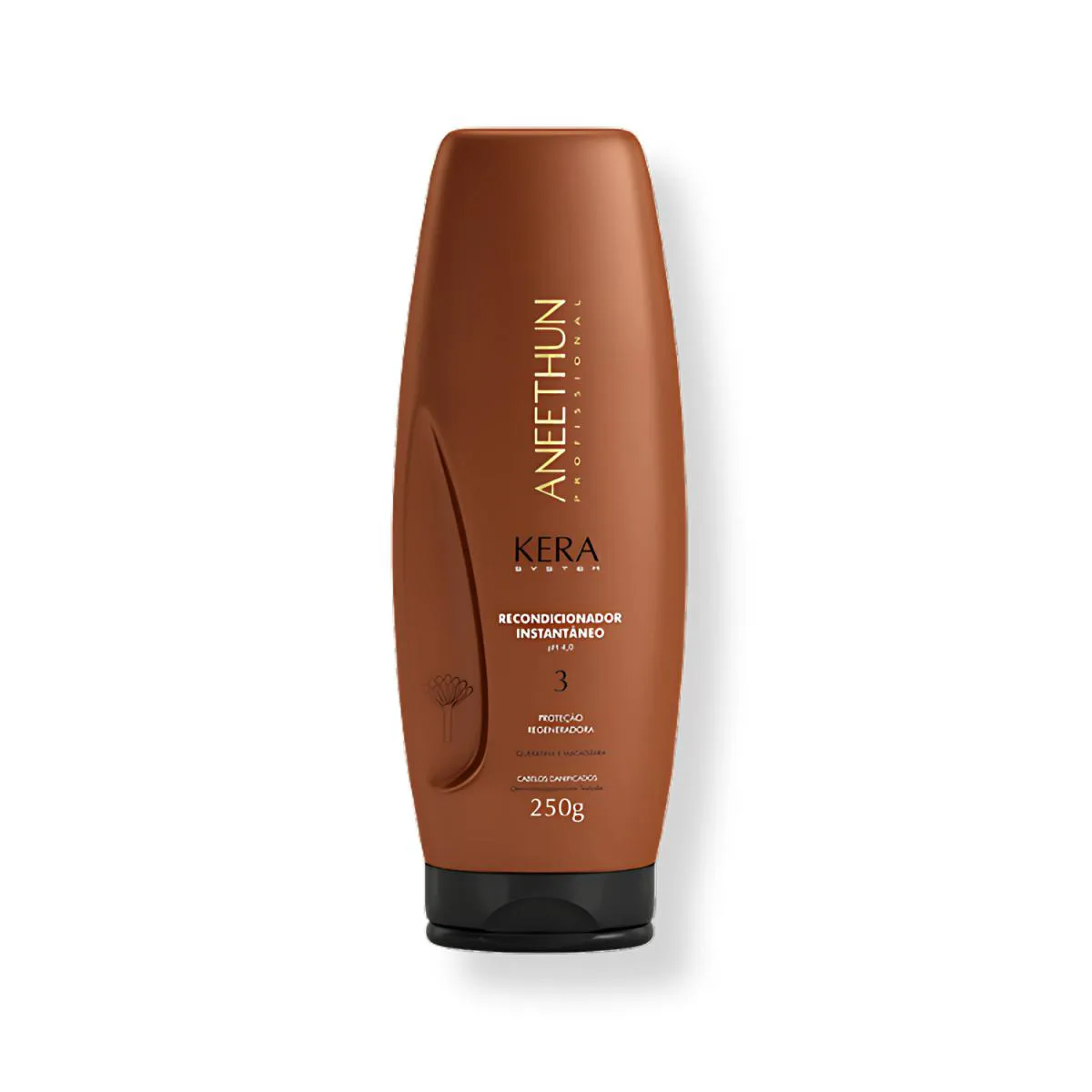 Aneethun Kera System - Recondicionador Instantâneo 250g O Recondicionador Instantâneo Aneethun Kera System é um tratamento profissional desenvolvido para cabelos danificados que necessitam de recuperação rápida e profunda. Sua fórmula rica em ativos como queratina hidrolisada, vitamina e e óleo de macadâmia promove reestruturação capilar, selando as cutículas e proporcionando condicionamento instantâneo. Benefícios: