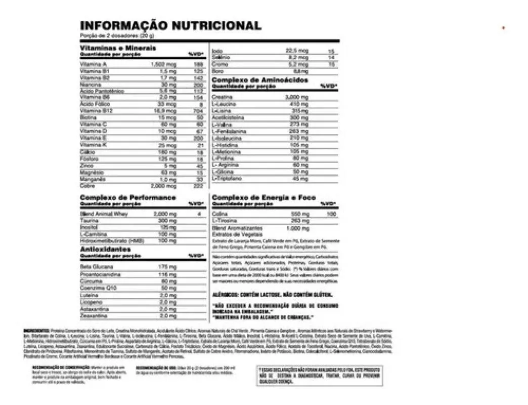 O Animal Pak Powder 600g da Universal Nutrition é um suplemento multivitamínico premium, formulado especialmente para atletas e praticantes de atividades físicas intensas. Com mais de 85 nutrientes de alta absorção, incluindo vitaminas, minerais, aminoácidos essenciais (EAA e bcaa), antioxidantes e extratos vegetais, este suplemento oferece suporte completo para o desempenho físico e mental. Cada dose equivale a 12 suplementos diferentes, proporcionando praticidade e eficácia em uma única fórmula Completo e Eficaz: Combina mais de 85 nutrientes essenciais para suporte nutricional abrangente.Desempenho Aprimorado: Auxilia no aumento de energia, foco e resistência durante os treinos.Recuperação Muscular: Contém aminoácidos que contribuem para a recuperação e crescimento muscular.Suporte Imunológico: Vitaminas e minerais que fortalecem o sistema imunológico.Praticidade: Fórmula em pó de fácil dissolução, disponível em sabores agradáveis como Lemon Grapefruit e Strawberry Watermelon.Versatilidade: Adequado para homens e mulheres que buscam otimizar seus resultados físico