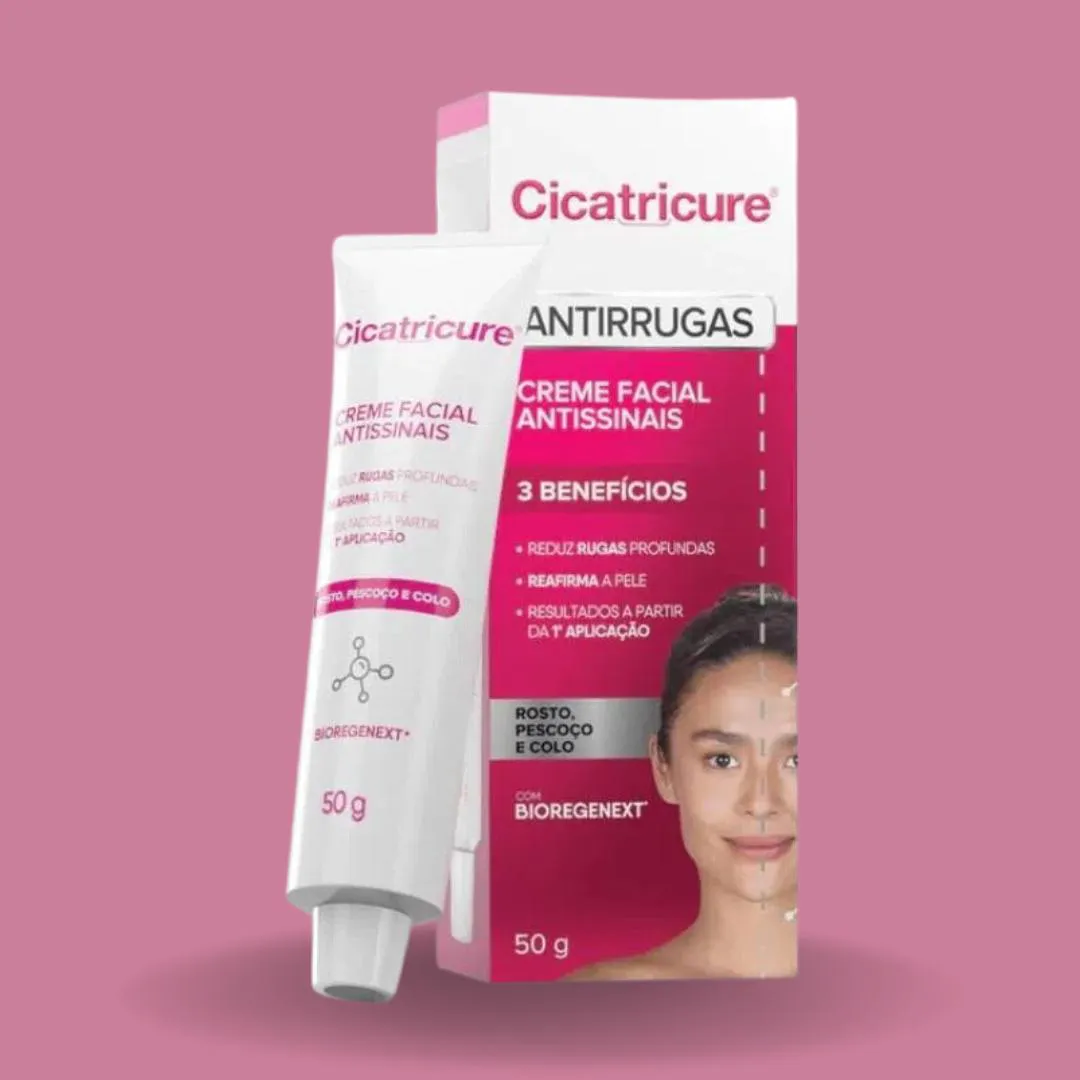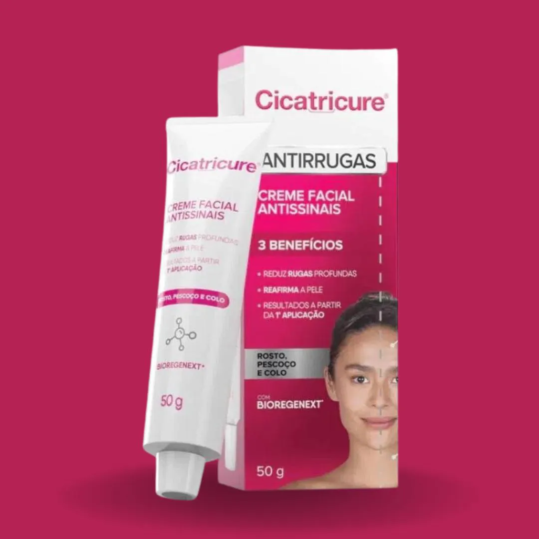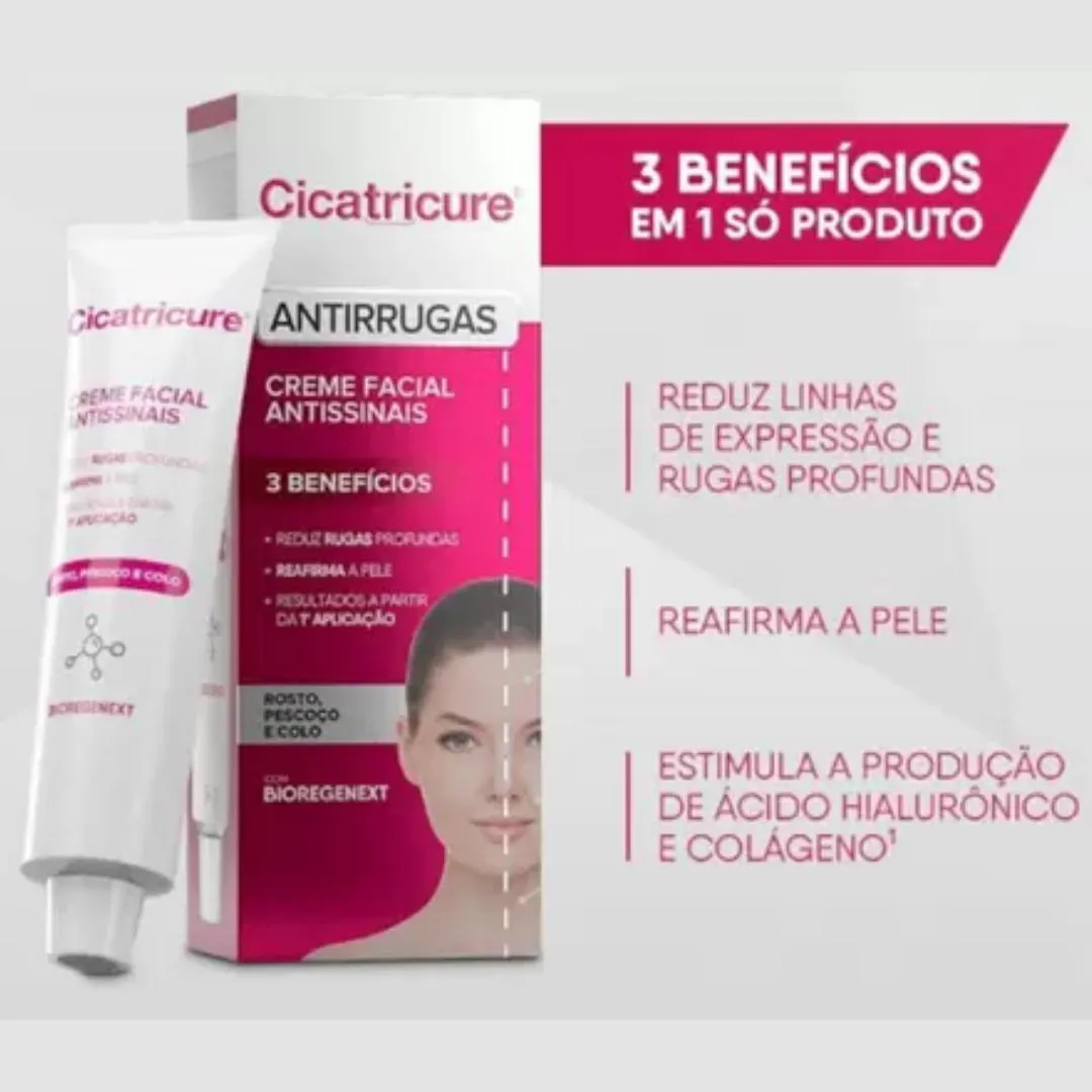Antissinais Creme Facial Combate as Rugas 50g - Cicatricure Desenvolvida para auxiliar no tratamento antirrugas, antissinais. Graças a sua fórmula com a exclusiva tecnologia Bio-Regenext, promove regeneração natural e reparação dos danos na pele, proporcionando uma aparência mais jovem. Benefícios: Pele mais hidratada, suave e iluminada desde a primeira aplicada. Pele mais firme, com redução de rugas e linhas de expressões a partir de 14 dias. Promove efeito Lifting Duradouro. Aumenta a produção de colágeno e Ácido Hialurônico. Reduz rugas profundas. Reafirma a pele. Ideal para rosto, pescoço e colo. Modo de uso: Aplique no rosto, pescoço e colo sobre a pele limpa e seca, durante a manhã e a noite, com movimentos suaves de baixo para cima até completa absorção.