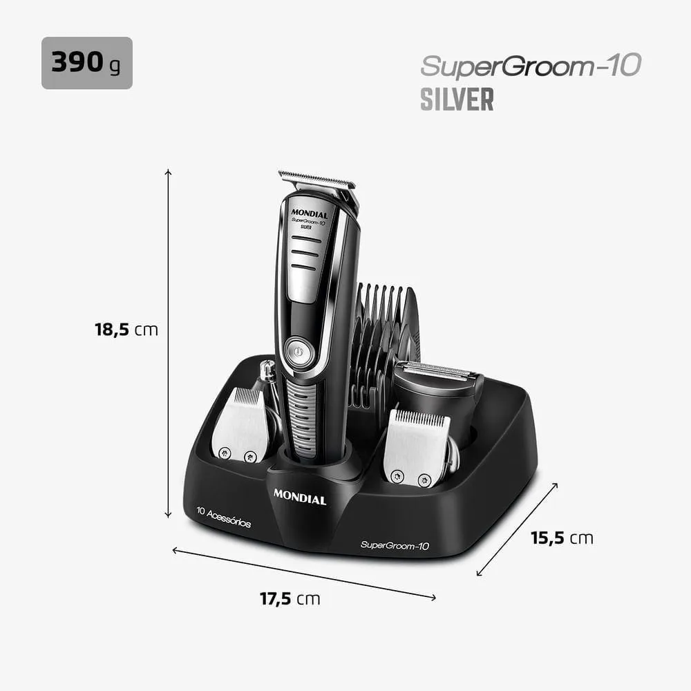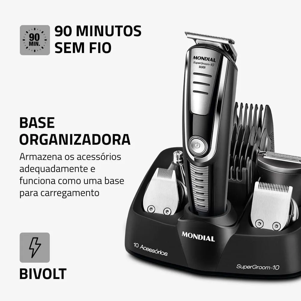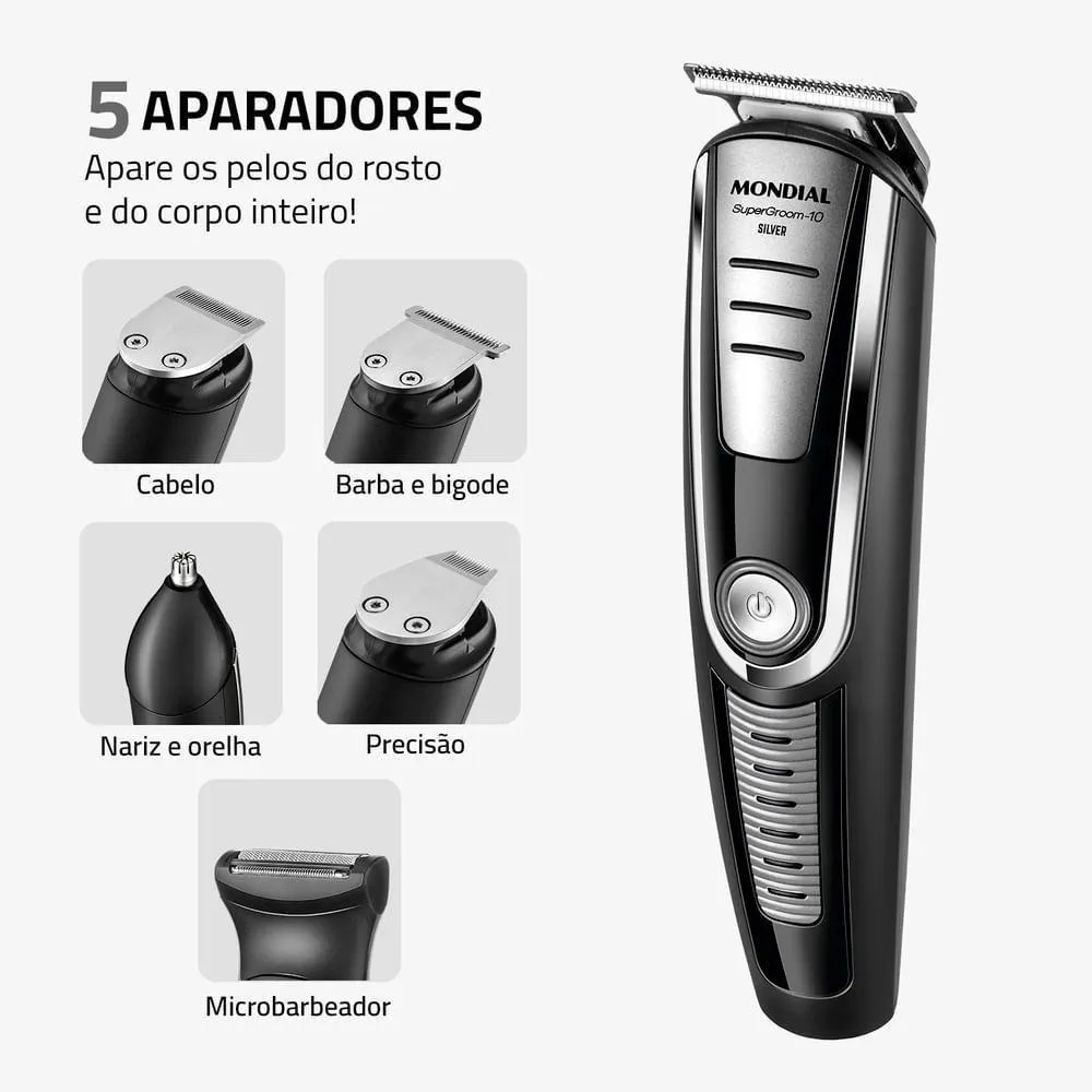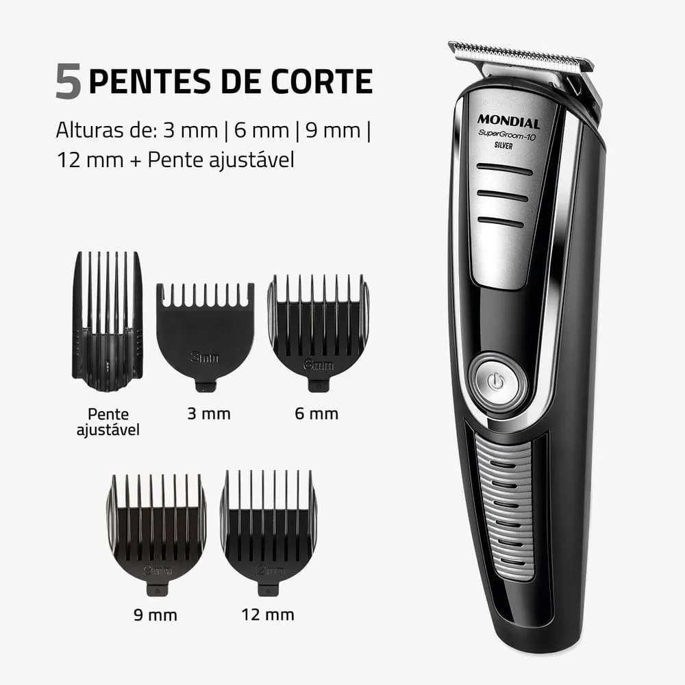 Aparador de Pelos Super Groom 10 Mondial Preto/Prata 6W BG-06 BivoltO Aparador de Pelos Super Groom 10 Mondial possui a funcionalidade de 10 produtos em 1! Conta com 5 aparadores para cabelo, rosto e corpo, 4 pentes de corte com guias de 3 mm, 6 mm, 9 mm e 12 mm, além de pente ajustável para a remoção dos pelos no comprimento que preferir. Suas lâminas em aço inox oferecem alto desempenho para um corte rente, preciso e suave.10 em 1 - Múltiplas FunçõesO aparador de pelos da Mondial vem com 10 acessórios: são 5 tipos de aparadores de alto desempenho e 5 pentes de corte com diferentes opções de altura para aparar e remover os pelos do rosto e do corpo inteiro. Você pode ter uma aparência impecável sem sair de casa!Pentes de Corte + Pente AjustávelAcompanha 4 pentes de corte com 3 mm, 6 mm, 9 mm e 12 mm, além de pente ajustável com 16 níveis de altura, permitindo aparar os pelos no comprimento desejado.Aparadores EspecíficosAparador de Cabelo: ideal para aparar os pelos do rosto, pescoço e corpo com total praticidade. Garante corte rente à pele quando usado sem pente de corte.Aparador de Barba e Bigode + Precisão: perfeito para aparar com precisão a barba e áreas menores, como pequenas linhas e detalhes.