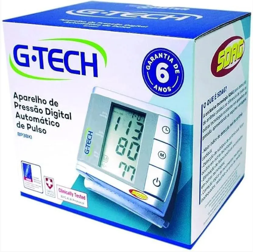 O estresse do dia a dia, aliado a hábitos pouco saudáveis e fatores hereditários, pode contribuir para o aumento da pressão arterial em pessoas de todas as idades. Por isso, a monitorização regular da pressão arterial em casa é essencial para o cuidado com a saúde. Para um acompanhamento seguro e preciso, conte com a qualidade dos produtos G-Tech. O Aparelho de Pressão Digital Automático de Pulso G-Tech BP3BK1 é a solução ideal para quem busca praticidade, precisão e confiabilidade no monitoramento da pressão arterial e da frequência cardíaca. Totalmente automático, ele realiza medições rápidas e confiáveis, com leitura clara em display LCD, além de exibir data e hora para melhor controle dos resultados. Com memória para até 99 medições, o BP3BK1 permite acompanhar a evolução da pressão ao longo do tempo. O aparelho conta ainda com a exclusiva Tecnologia SDAG de Detecção de Arritmia, que aumenta a precisão ao identificar subtipos de arritmia que podem passar despercebidos em outras tecnologias, além de reduzir erros causados por movimentos inadequados durante a medição. Fabricado com alto padrão de qualidade, o produto possui 6 anos de garantia, oferecendo segurança, durabilidade e a credibilidade da marca G-Tech.Principais Características e Benefícios