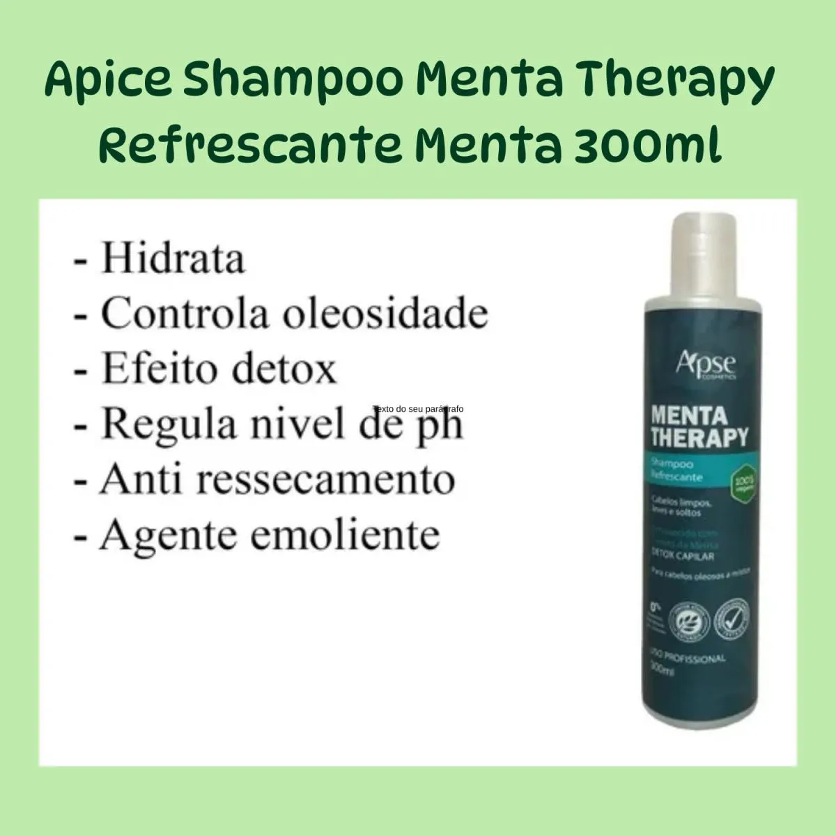 hampoo Refrescante Apice Menta Therapy 300ml além de limpar os fios, controla o excesso de sebo e regula o nível de pH. Também purifica o