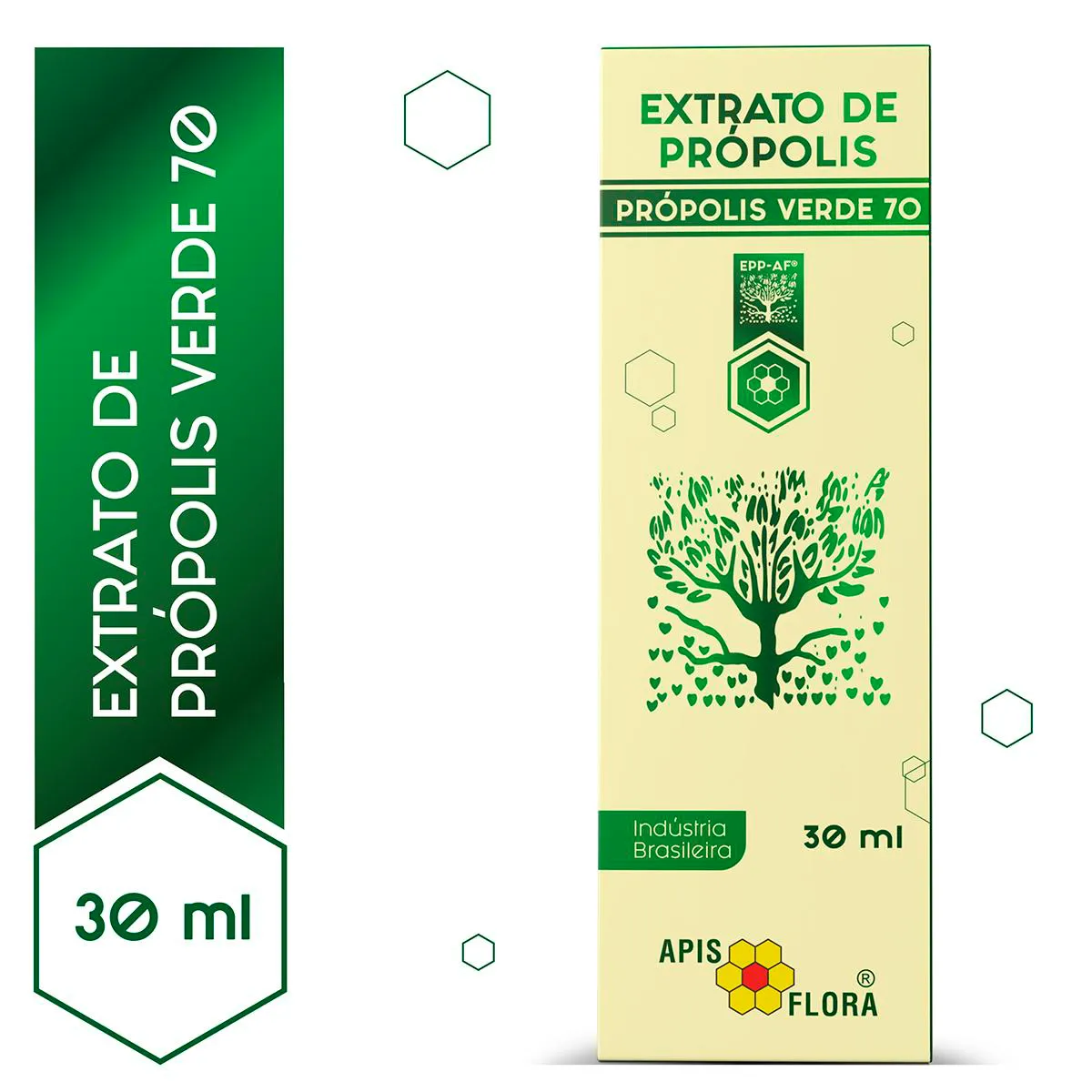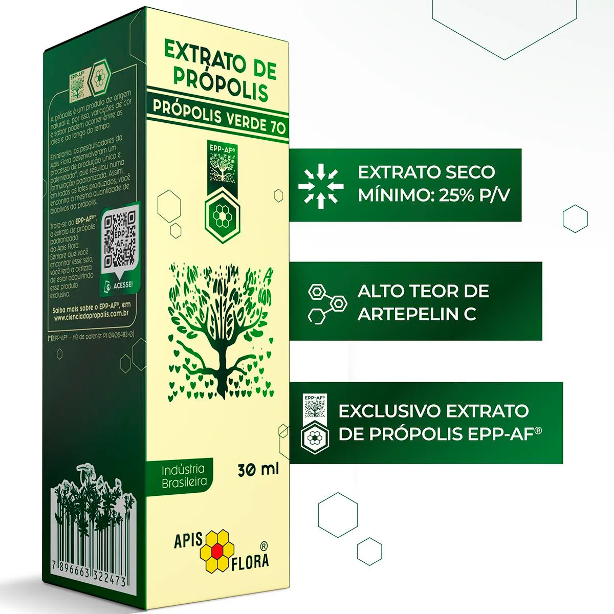O Extrato de Própolis Verde Apis Flora 70 é um suplemento natural de alta concentração, formulado com 70% de própolis verde in natura em solução hidroalcoólica. Produzido a partir da planta brasileira Baccharis dracunculifolia (conhecida como Vassourinha ou Alecrim do Campo), este extrato é rico em compostos bioativos, especialmente o Artepillin C, reconhecido por suas propriedades terapêuticas, como: