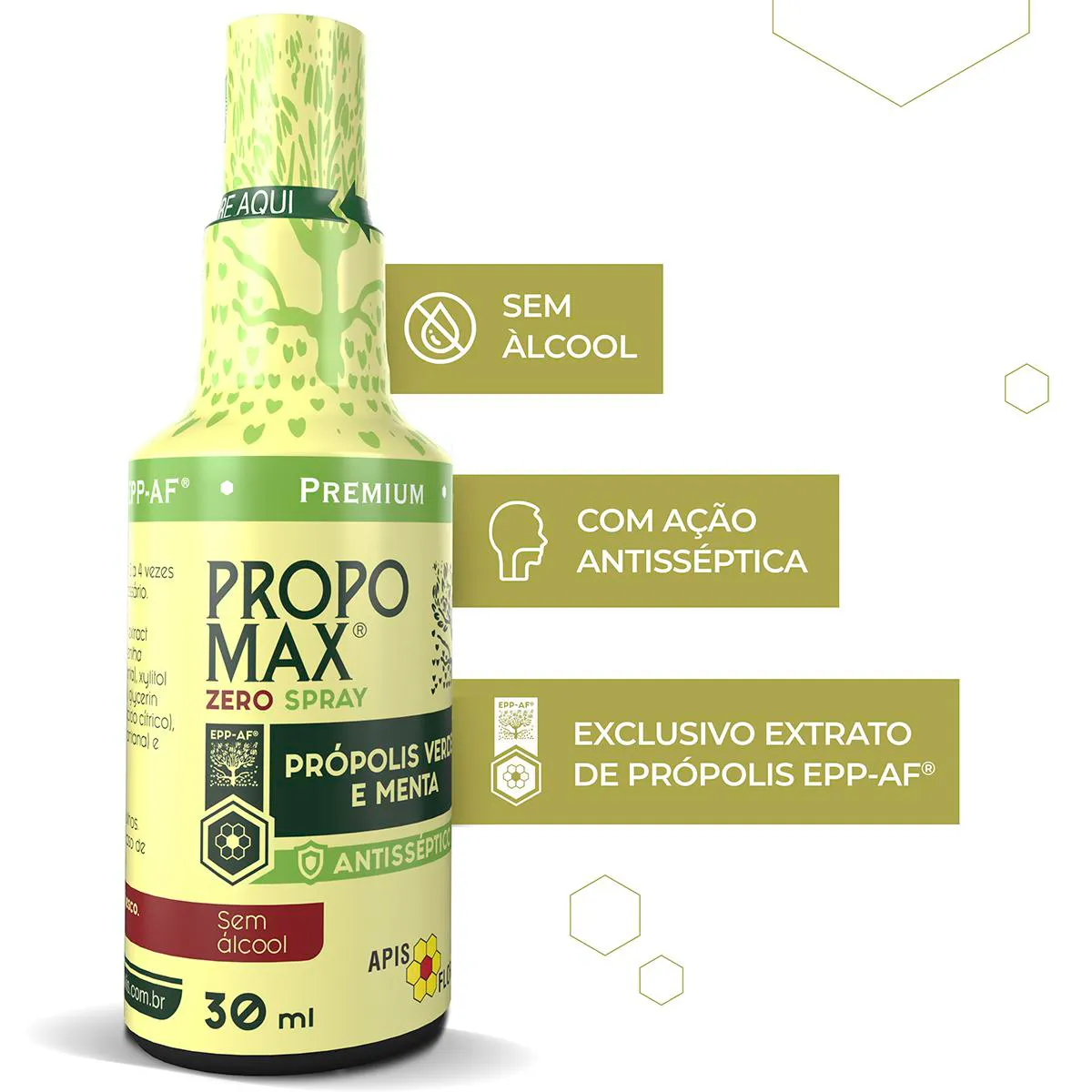 O Spray para Garganta Api Flora Propomax Zero Própolis Verde e Menta é um spray antisséptico bucal composto por extrato de própolis e óleo essencial de menta (Mentha piperita). Sua fórmula é livre de álcool e açúcares, sendo especialmente indicada para pessoas com restrições ao consumo dessas substâncias, como diabéticos. Com propriedades cicatrizante, anti-inflamatória e antimicrobiana, o produto é ideal para aliviar sintomas de garganta inflamada, tosse, aftas e também para refrescar e purificar o hálito.