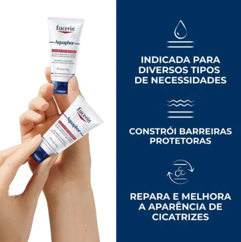 Eucerin Aquaphor é um creme com reparação intensiva da pele muito seca, áspera ou hipersensibilizada. Formulado com Pantenol, Glicerina e Bisabolol, hidrata e acalma a área afetada, criando uma barreira protetora que protege a umidade da pele. Possui uma textura suave e é ideal para diversos tipos de necessidades. Ajuda a tratar queimaduras leves. Protege e previne assaduras. Melhora a aparência de cicatrizes. Hidrata peles muito secas ou sensibilizadas. Suaviza áreas ressecadas, como mãos, cutículas, pés e calcanhares. Ajuda na hidratação após tatuagens. Adequado para passar em bebês e crianças.