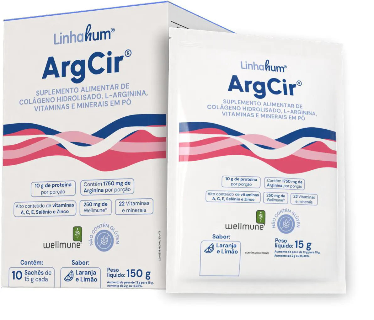 Argcir é um suplemento alimentar em pó, rico em proteínas (10 g), que combina peptídeos de